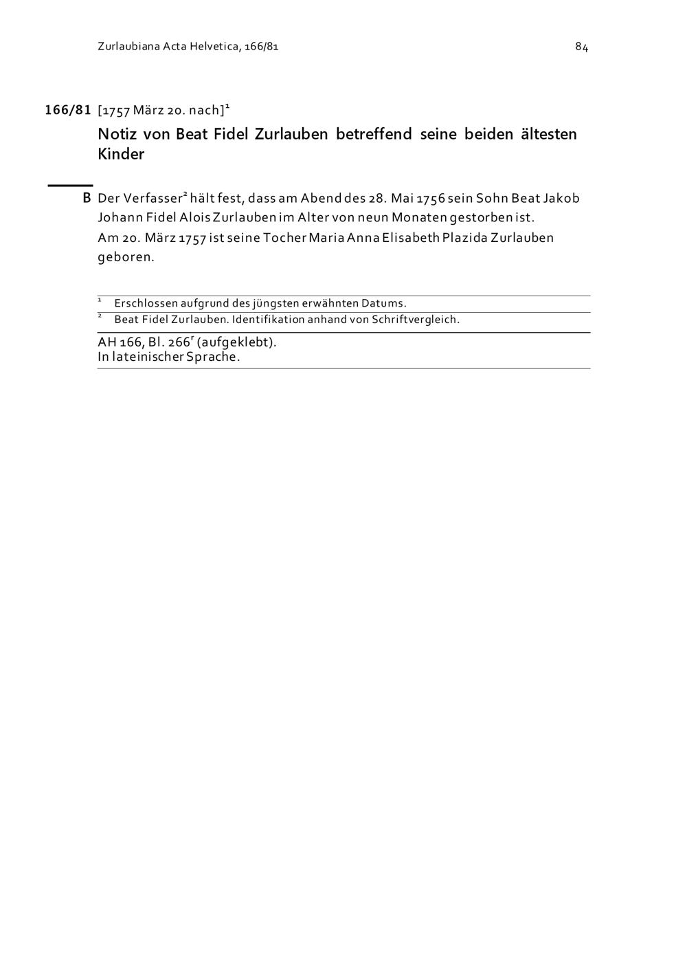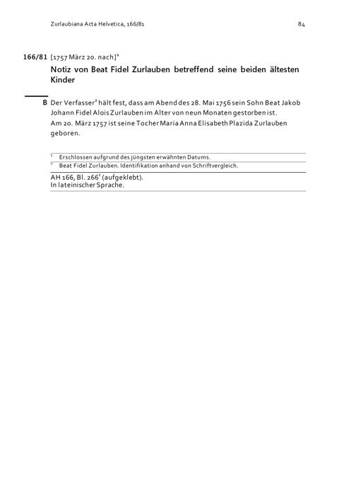 Notiz von Beat Fidel Zurlauben betreffend seine beiden ältesten Kinder