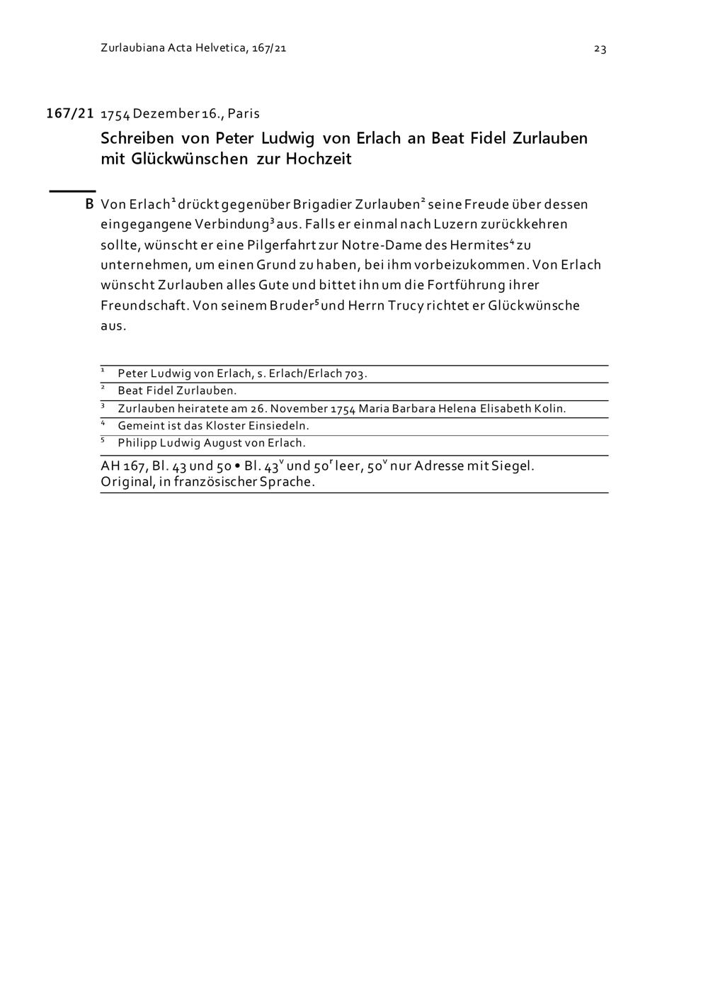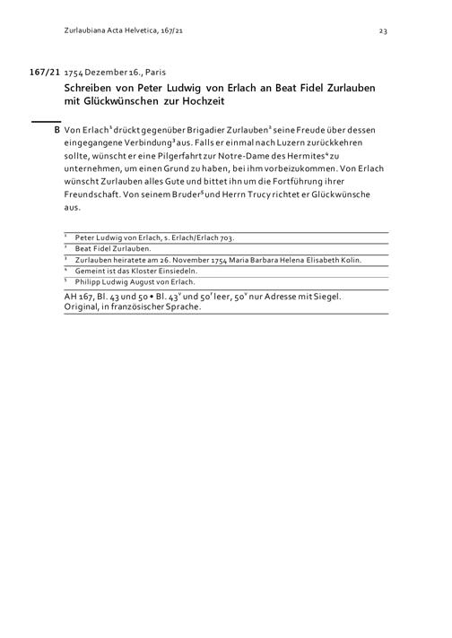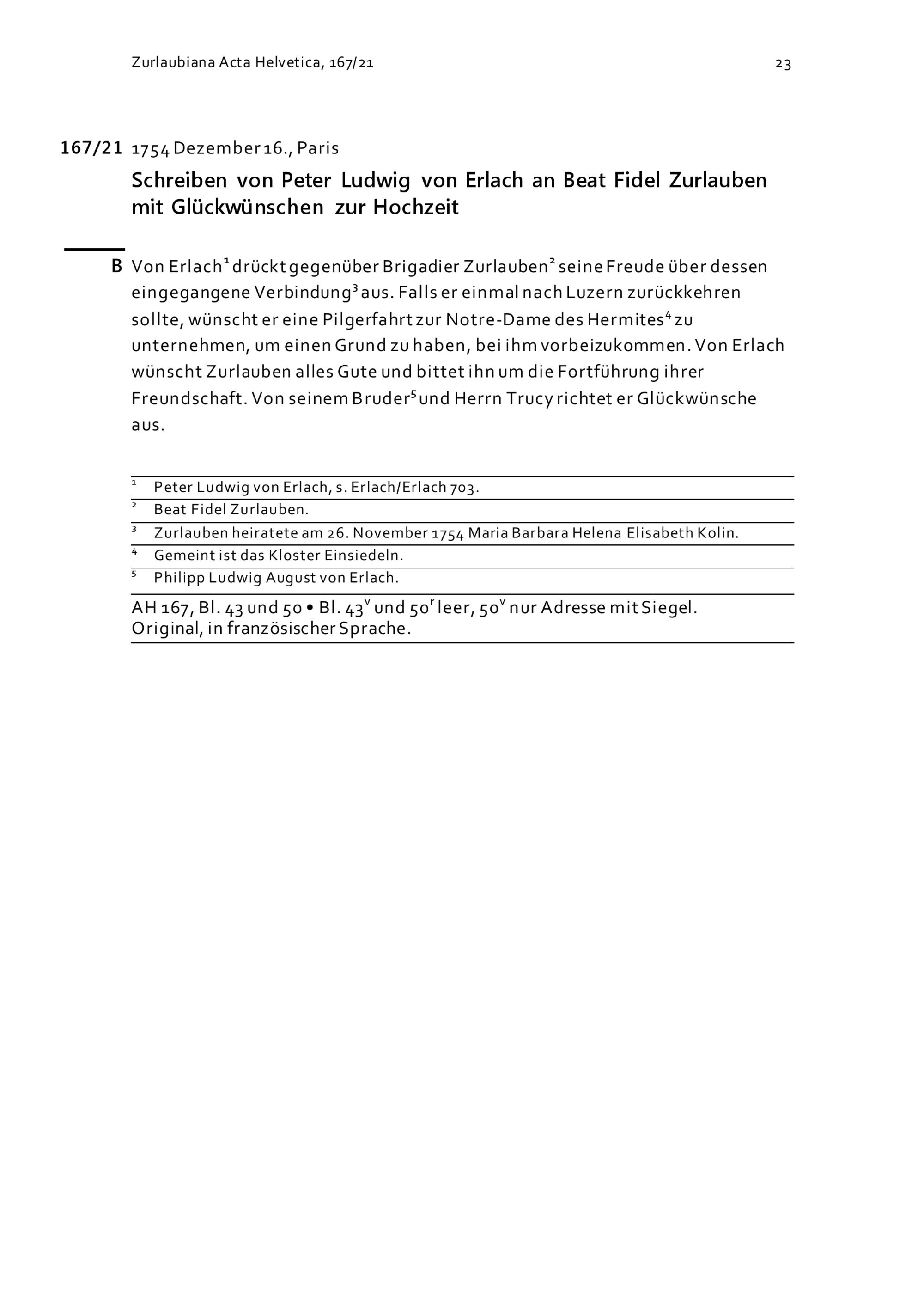 Schreiben von Peter Ludwig von Erlach an Beat Fidel Zurlauben mit Glückwünschen zur Hochzeit