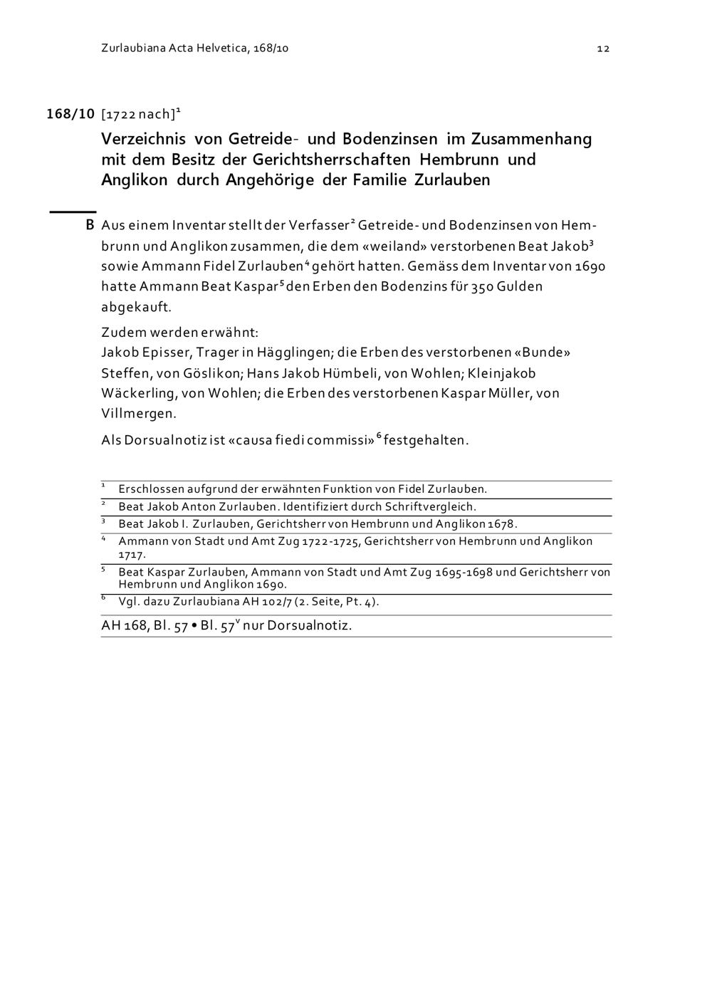 Verzeichnis von Getreide- und Bodenzinsen in Zusammenhang mit dem Besitz der Gerichtsherrschaften Hembrunn und Anglikon durch Angehörige der Familie Zurlauben