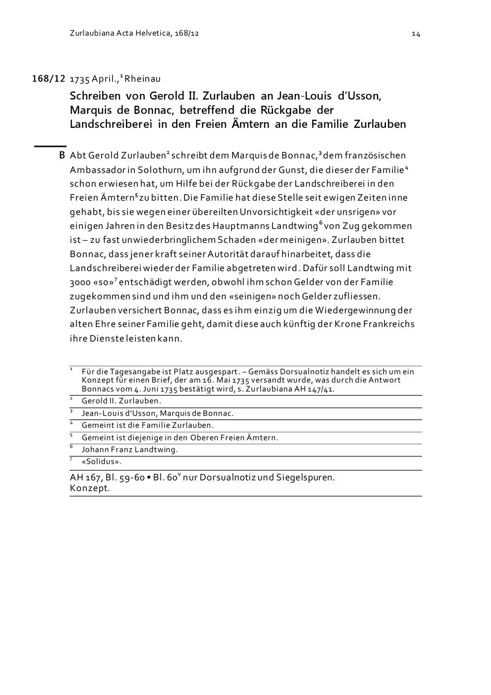 Schreiben von Gerold II. Zurlauben an Jean-Louis d'Usson, Marquis de Bonnac, betreffend...