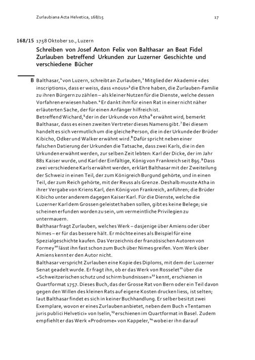 Schreiben von Josef Anton Felix Balthasar an Beat Fidel Zurlauben betreffend Urkunden zur Luzerner Geschichte und verschiedene Bücher