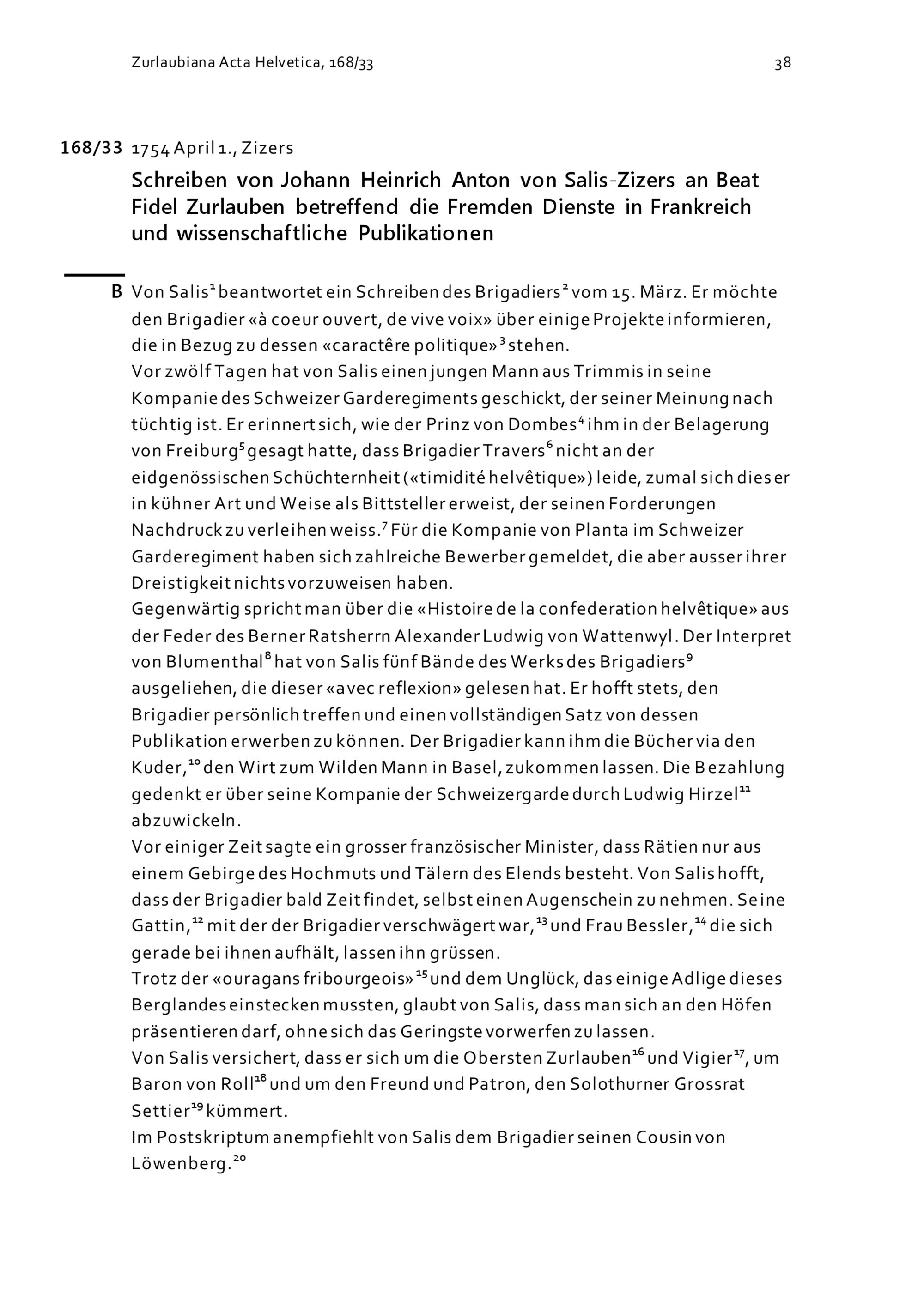 Schreiben von Johann Heinrich Anton von Salis-Zizers an Beat Fidel Zurlauben betreffend die Fremden Dienste in Frankreich und wissenschaftliche Publikationen