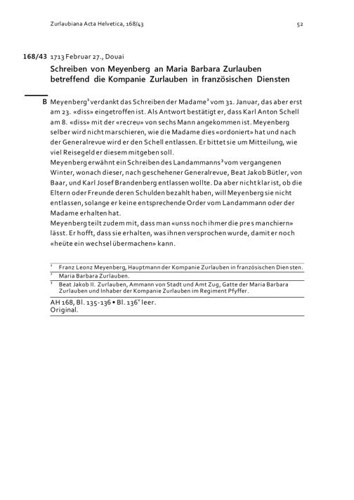 Schreiben von Meyenberg an Maria Barbara Zurlauben betreffend die Kompanie Zurlauben in französischen Diensten