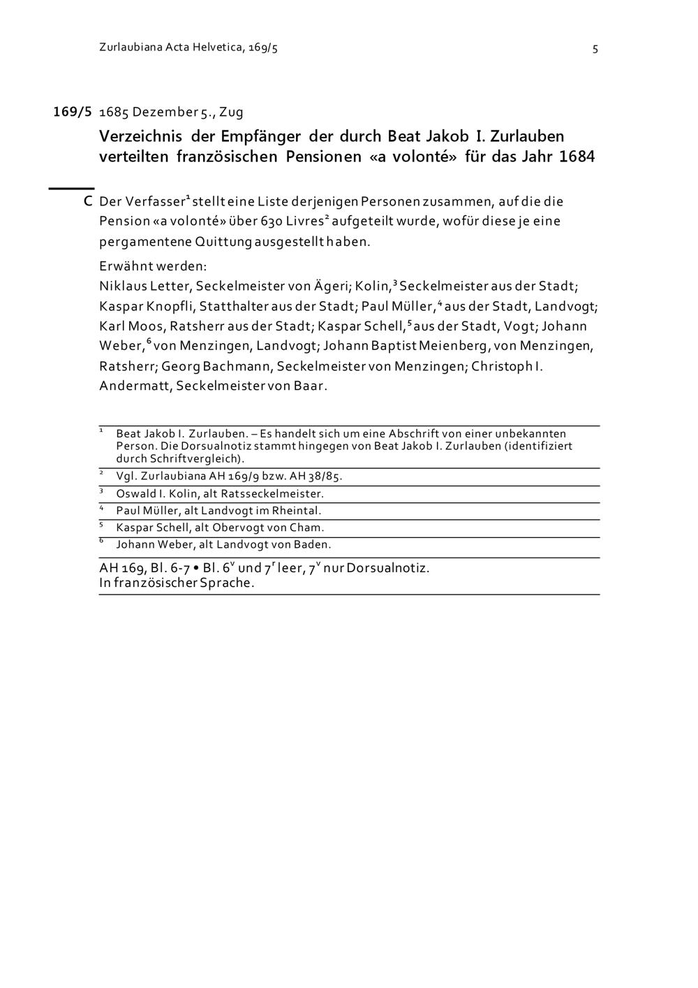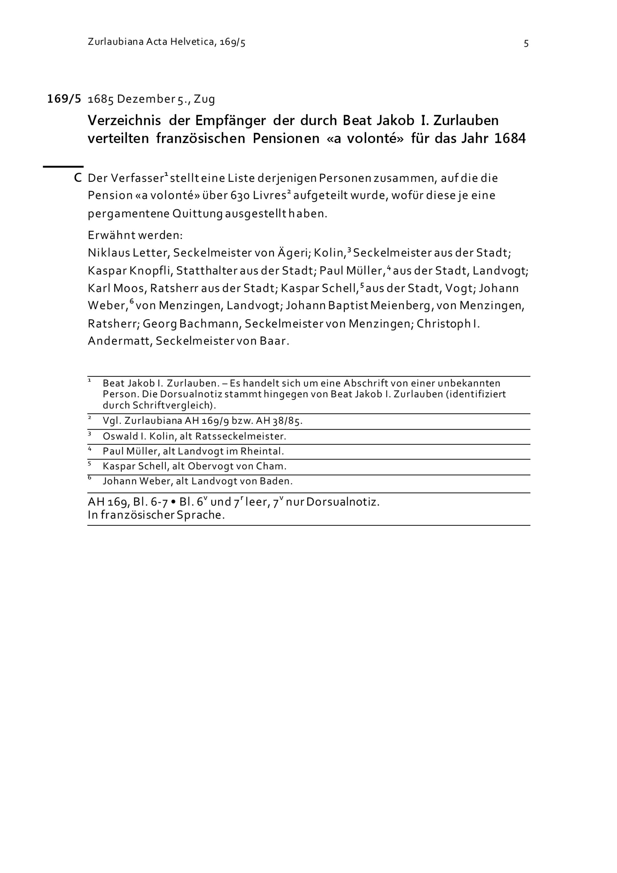 Verzeichnis der Empfänger der durch Beat Jakob I. Zurlauben verteilten französischen Pensionen für das Jahr 1684