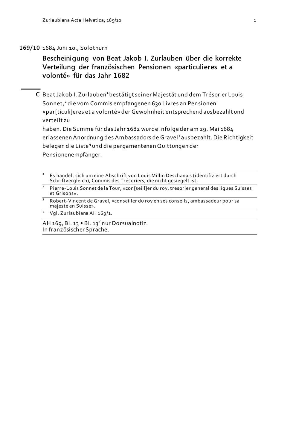 Bescheinigung von Beat Jakob I. Zurlauben über die korrekte Verteilung der französischen Pensionen für das Jahr 1682