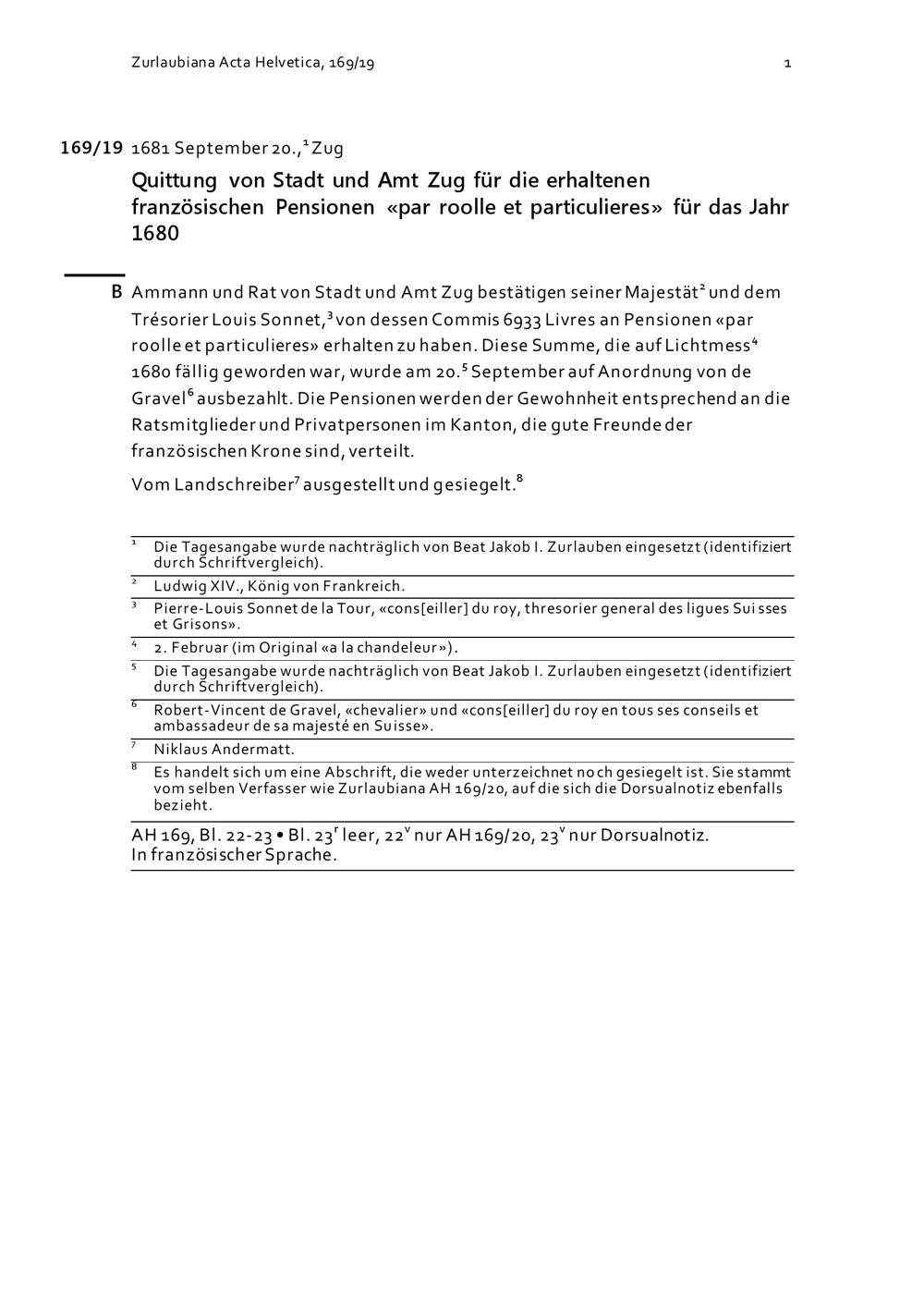 Quittung von Stadt und Amt Zug für die erhaltenen französischen Pensionen für das Jahr 1680