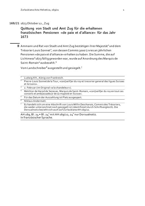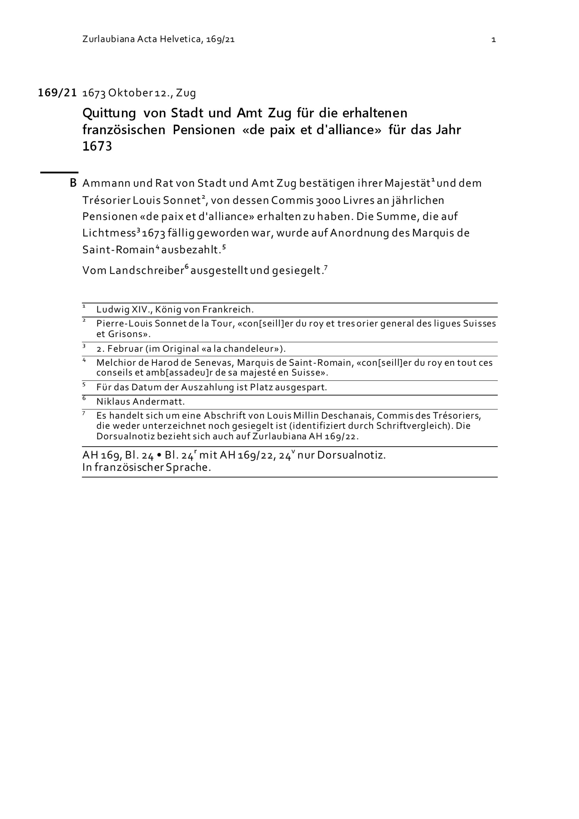 Quittung von Stadt und Amt Zug für die erhaltenen französischen Pensionen für das Jahr 1673