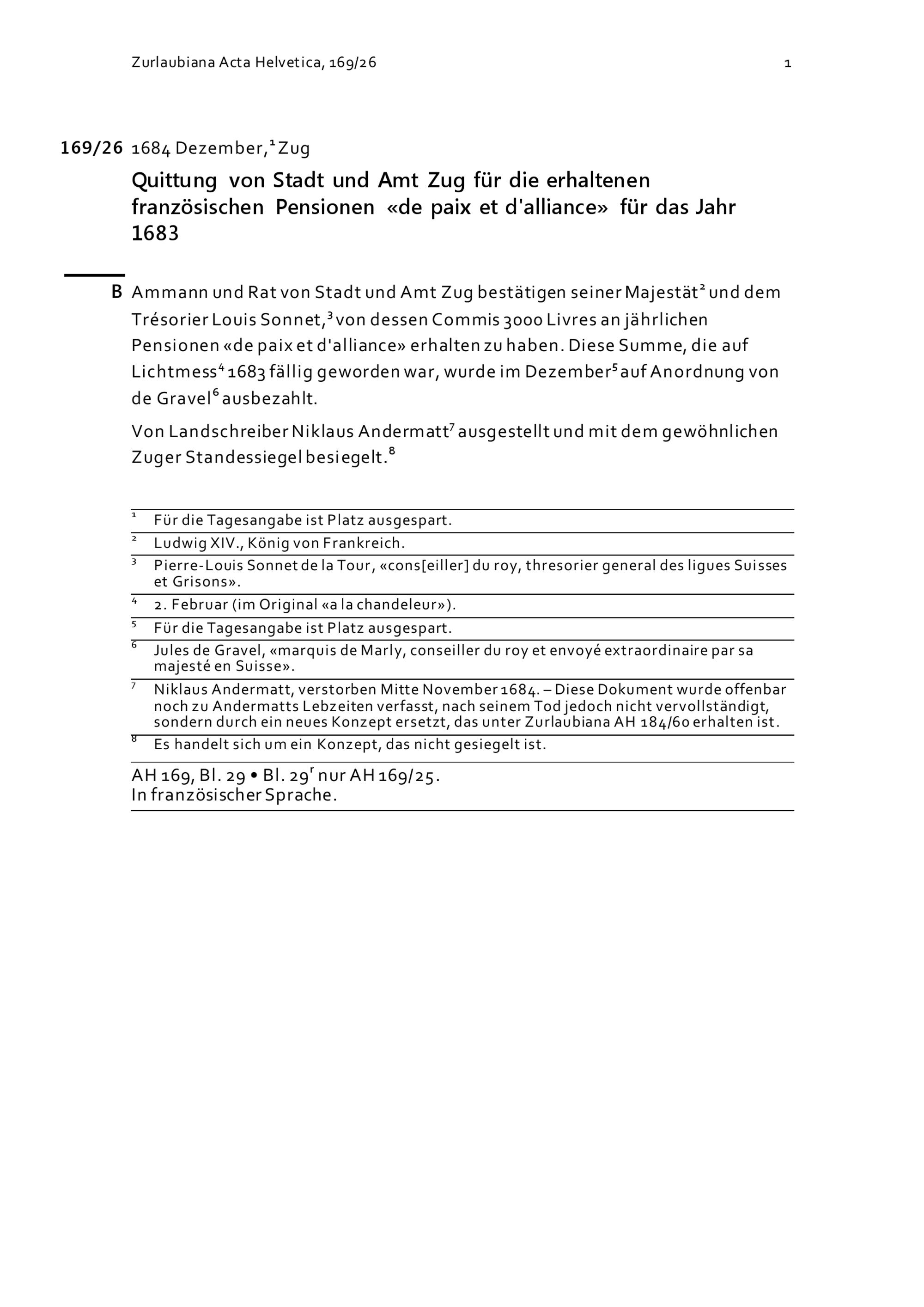 Quittung von Stadt und Amt Zug für die erhaltenen französischen Pensionen für das Jahr 1683