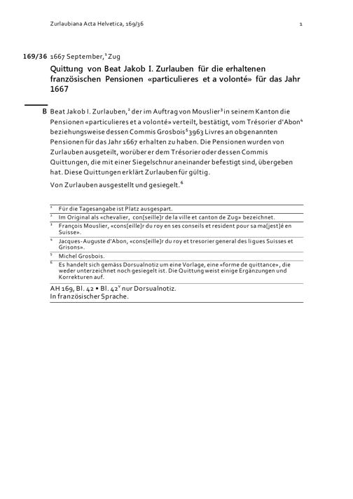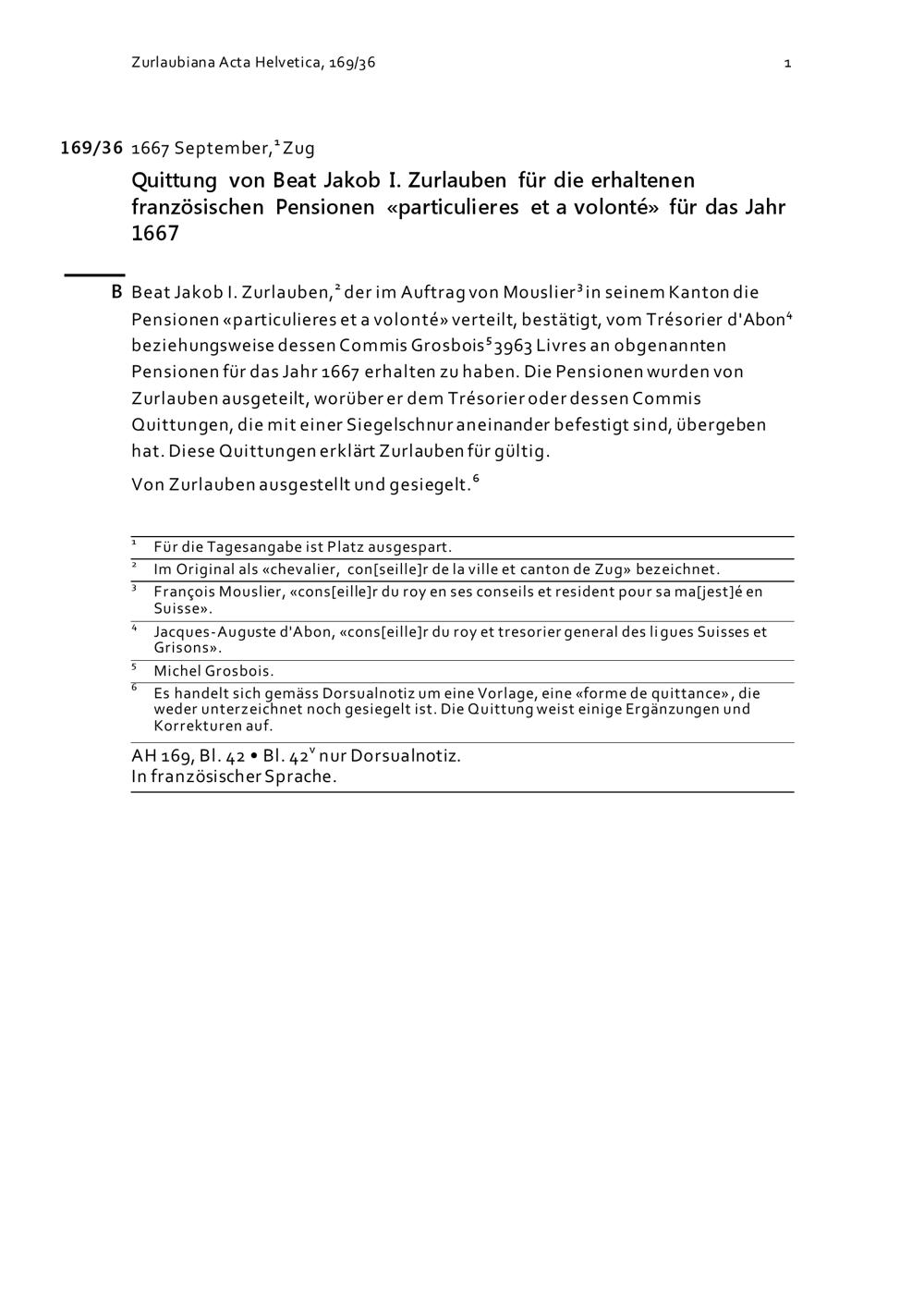 Quittung von Beat Jakob I. Zurlauben für die erhaltenen französischen Pensionen für das Jahr 1667