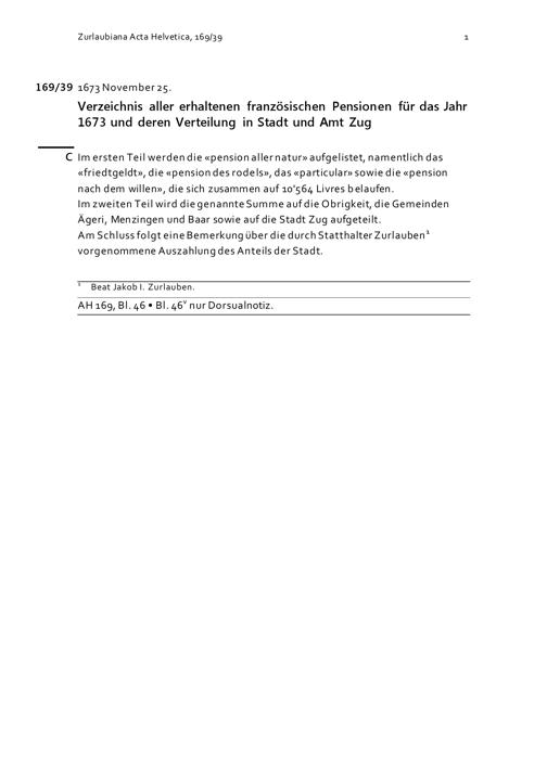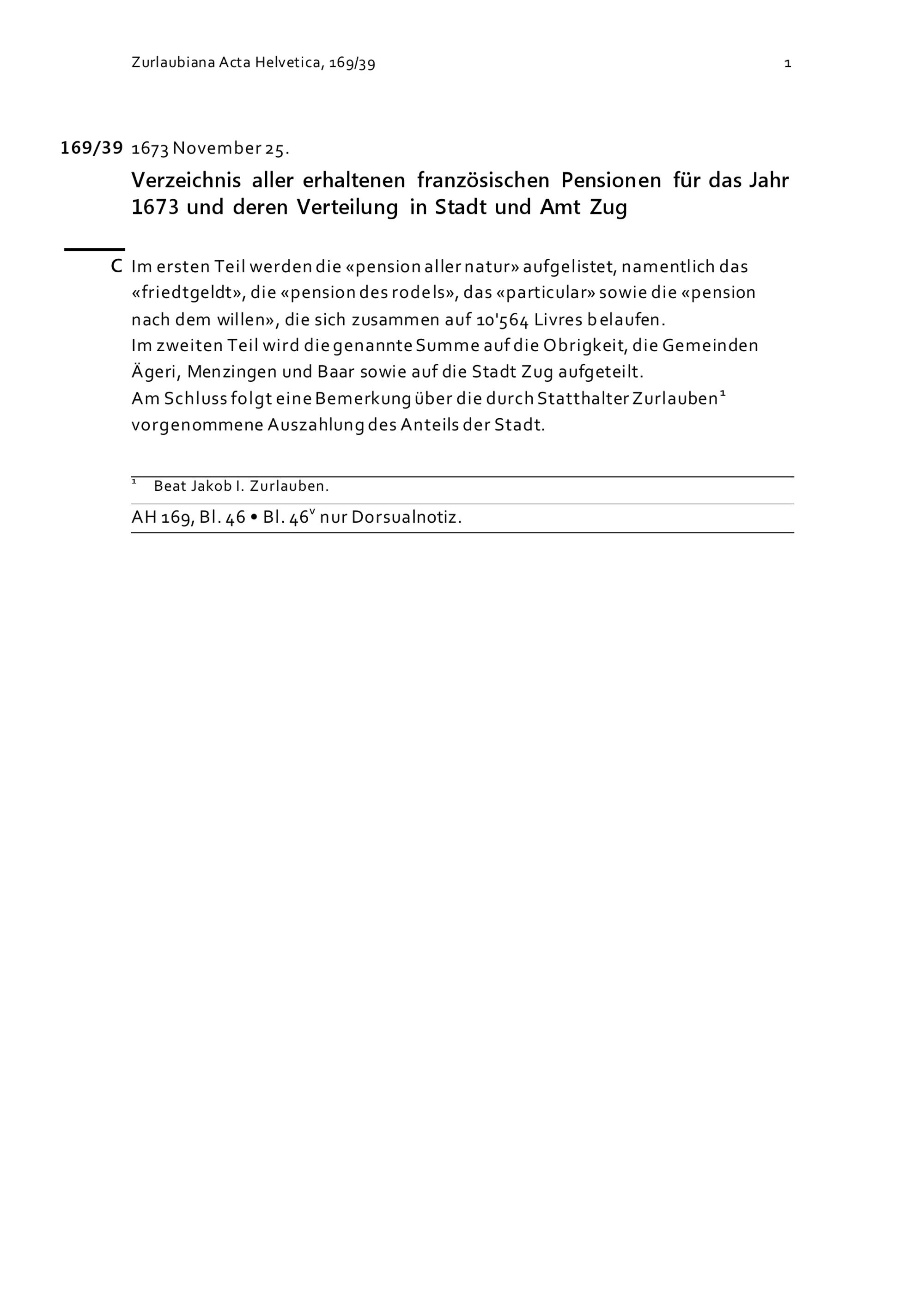 Verzeichnis aller erhaltenen französischen Pensionen für das Jahr 1673 und deren Verteilung in Stadt und Amt Zug
