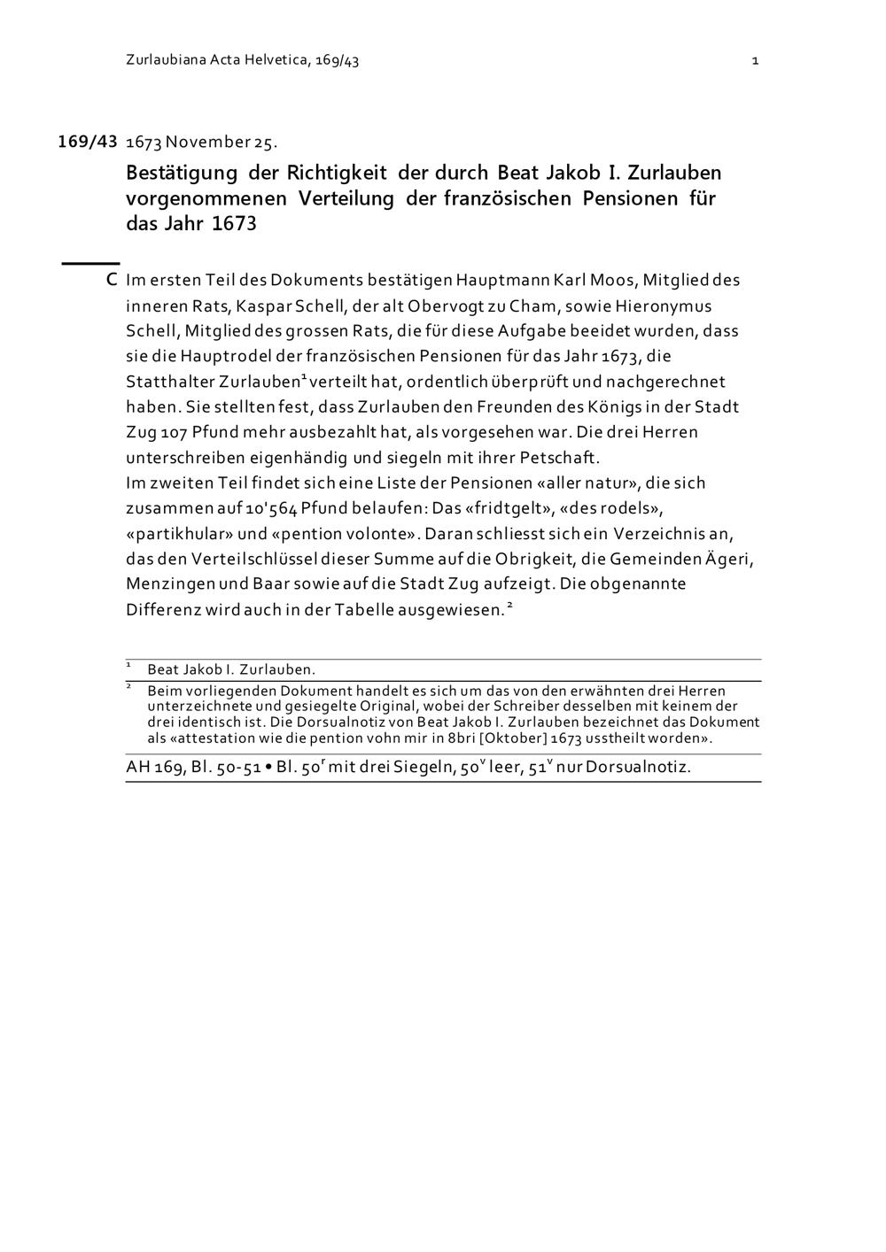 Bestätigung der Richtigkeit der durch Beat Jakob I. Zurlauben vorgenommenen Verteilung der französischen Pensionen für das Jahr 1673