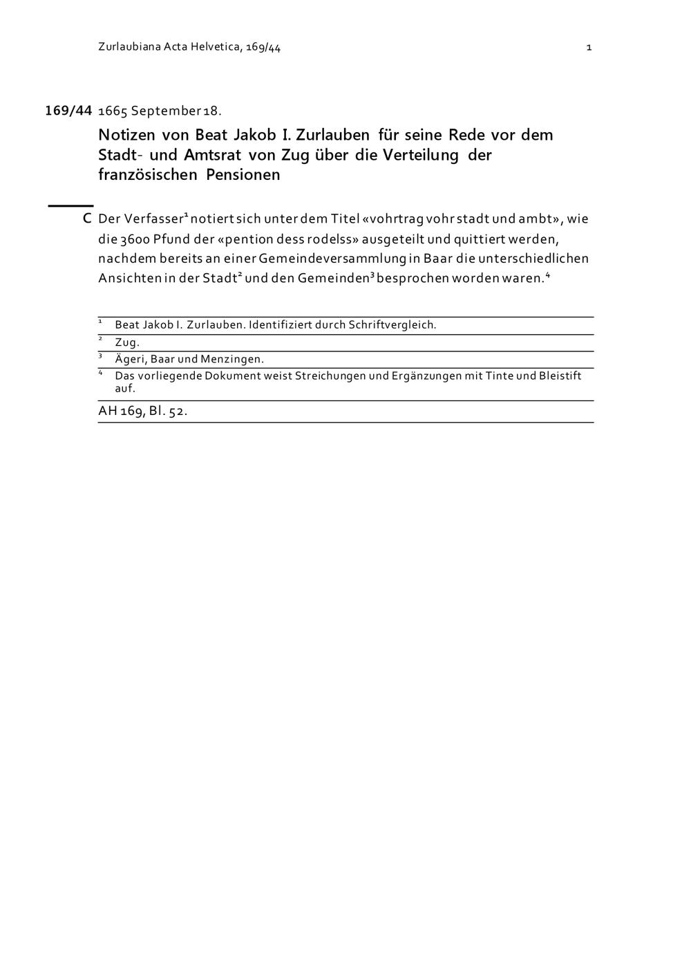 Notiz von Beat Jakob I. Zurlauben für seine Rede vor dem Stadt- und Amtsrat von Zug betreffend die Verteilung der französischen Pensionen