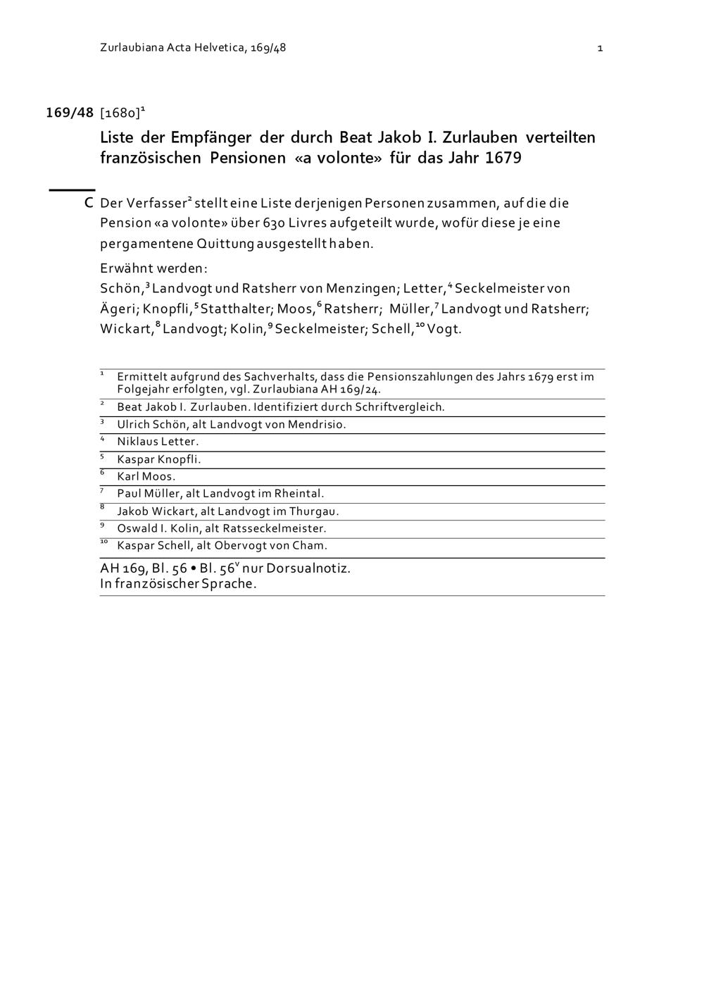 Empfänger der durch Beat Jakob I. Zurlauben verteilten französischen Pensionen für das Jahr 1679