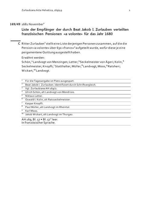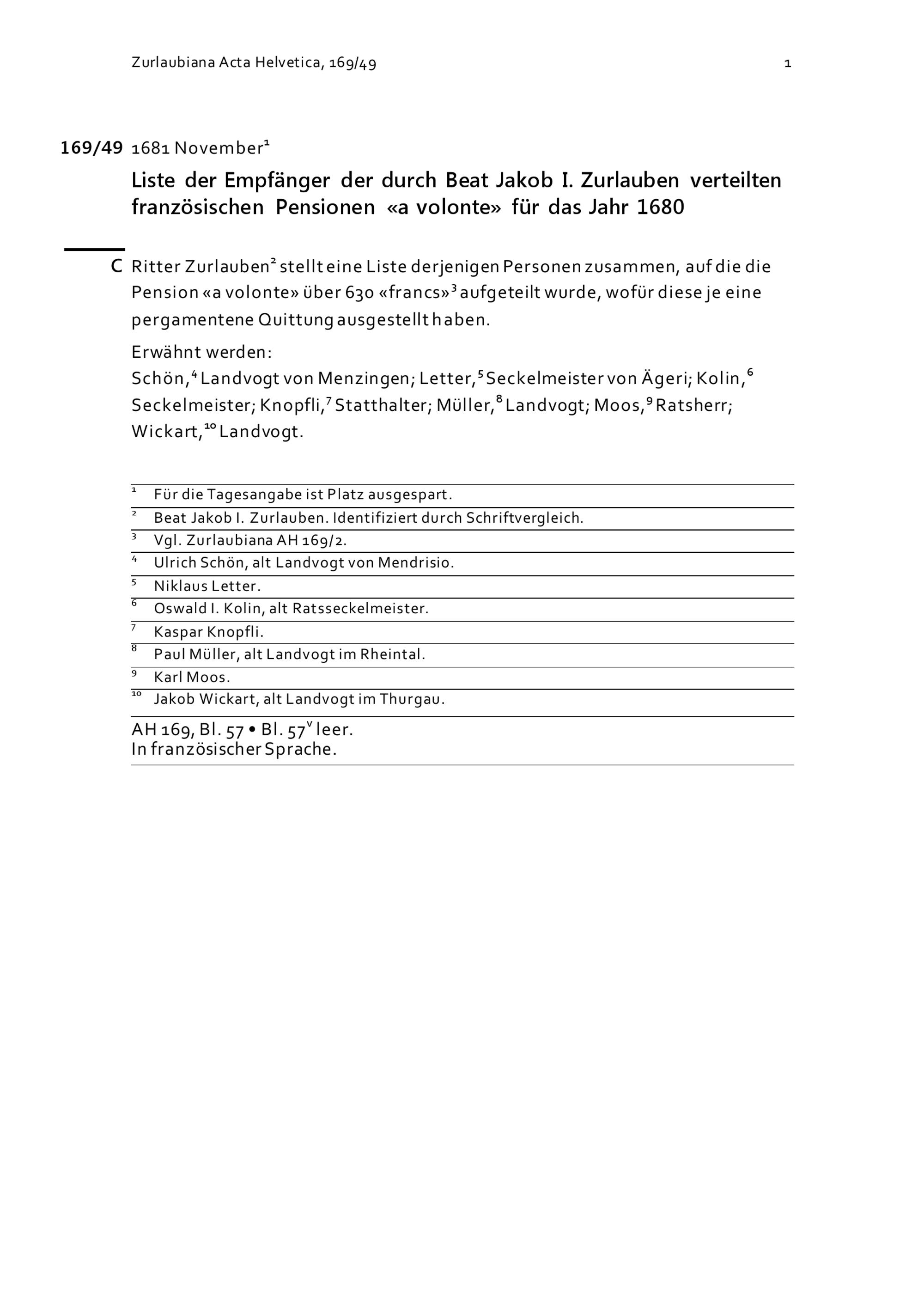 Empfänger der durch Beat Jakob I. Zurlauben verteilten französischen Pensionen für das Jahr 1680