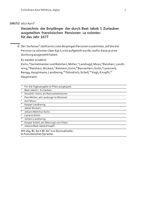Verzeichnis der Empfänger der durch Beat Jakob I. Zurlauben ausgeteilten französischen Pensionen für das Jahr 1677