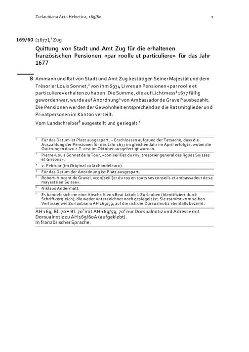 Quittung von Stadt und Amt Zug für die erhaltenen französischen Pensionen für das Jahr 1677