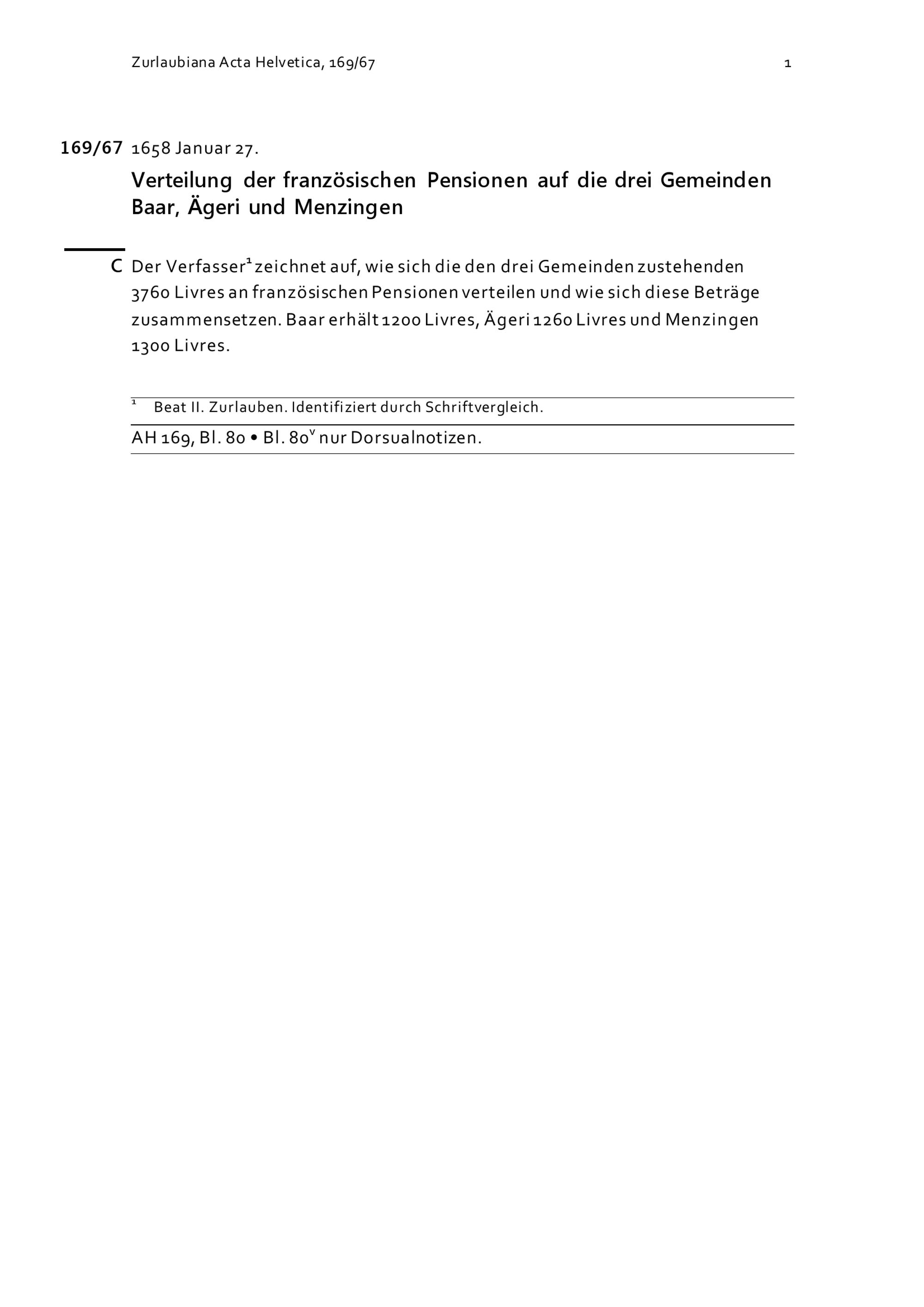 Verteilung der französischen Pensionen auf die drei Gemeinden Baar, Ägeri und Me...