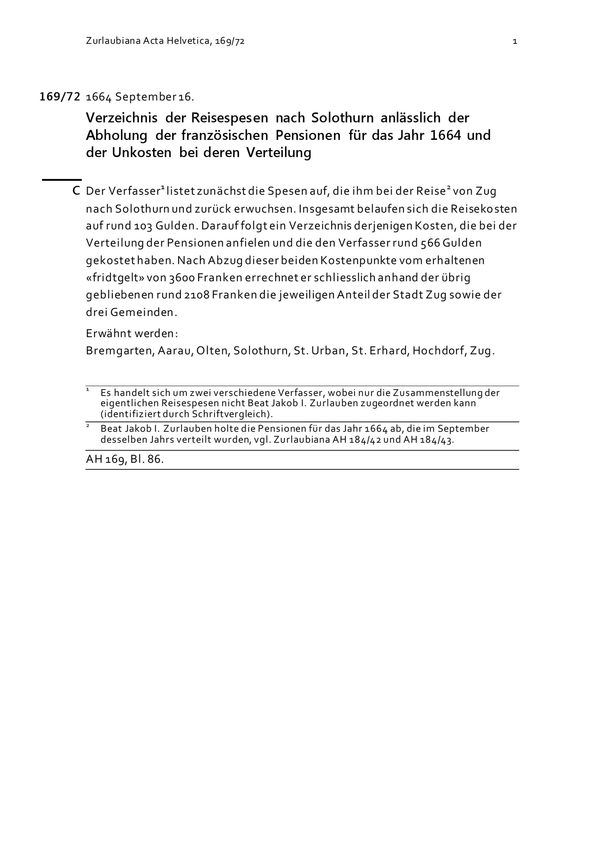 Verzeichnis der Reisespesen nach Solothurn anlässlich der Abholung der französischen Pensionen für das Jahr 1664 und Verzeichnis der Unkosten bei deren Verteilung