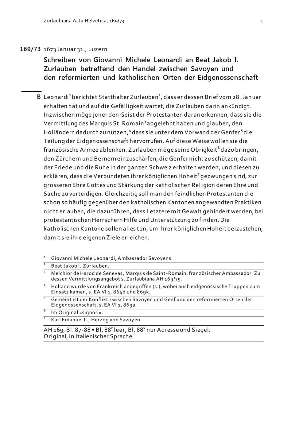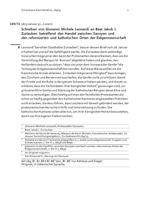 Schreiben von Giovanni Michele Leonardi an Beat Jakob I. Zurlauben betreffend den Handel zwischen Savoyen und den reformierten und Katholischen Orten der Eidgenossenschaft