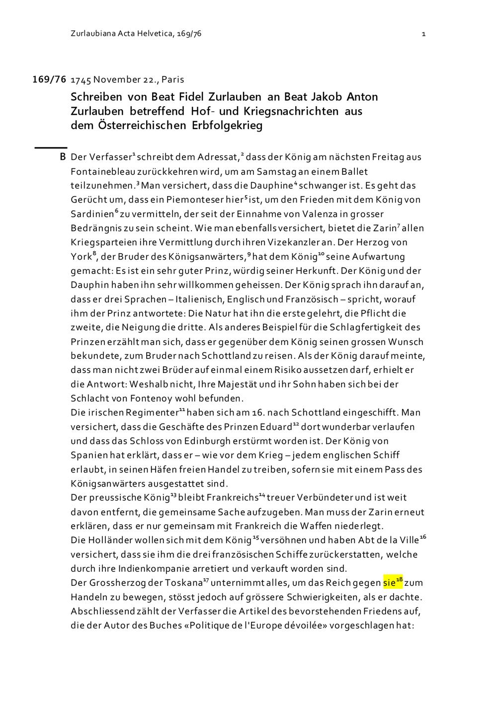 Schreiben von Beat Fidel Zurlauben an Beat Jakob Anton Zurlauben betreffend Hof- und Kriegsnachrichten aus dem österreichischen Erbfolgekrieg
