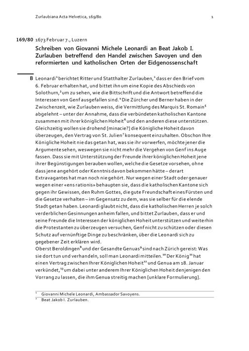 Schreiben von Giovanni Michele Leonardi an Beat Jakob I. Zurlauben betreffend den Handel zwischen Savoyen und den reformierten und Katholischen Orten der Eidgenossenschaft