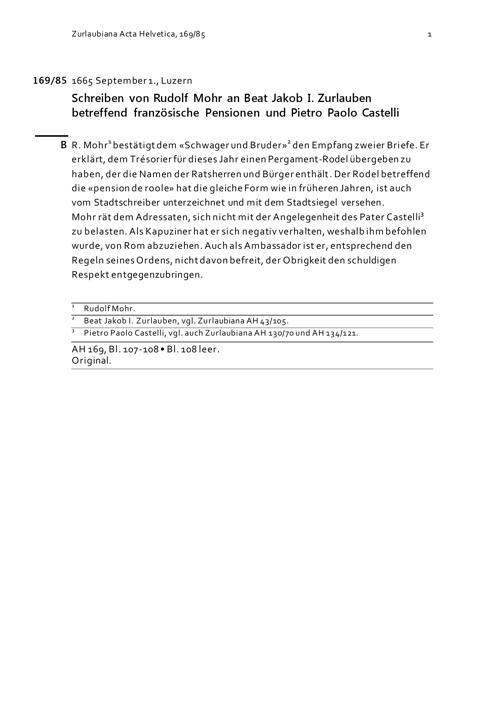 Schreiben von Rudolf Mohr an Beat Jakob I. Zurlauben betreffend französische Pensionen und Pietro Paolo Castelli