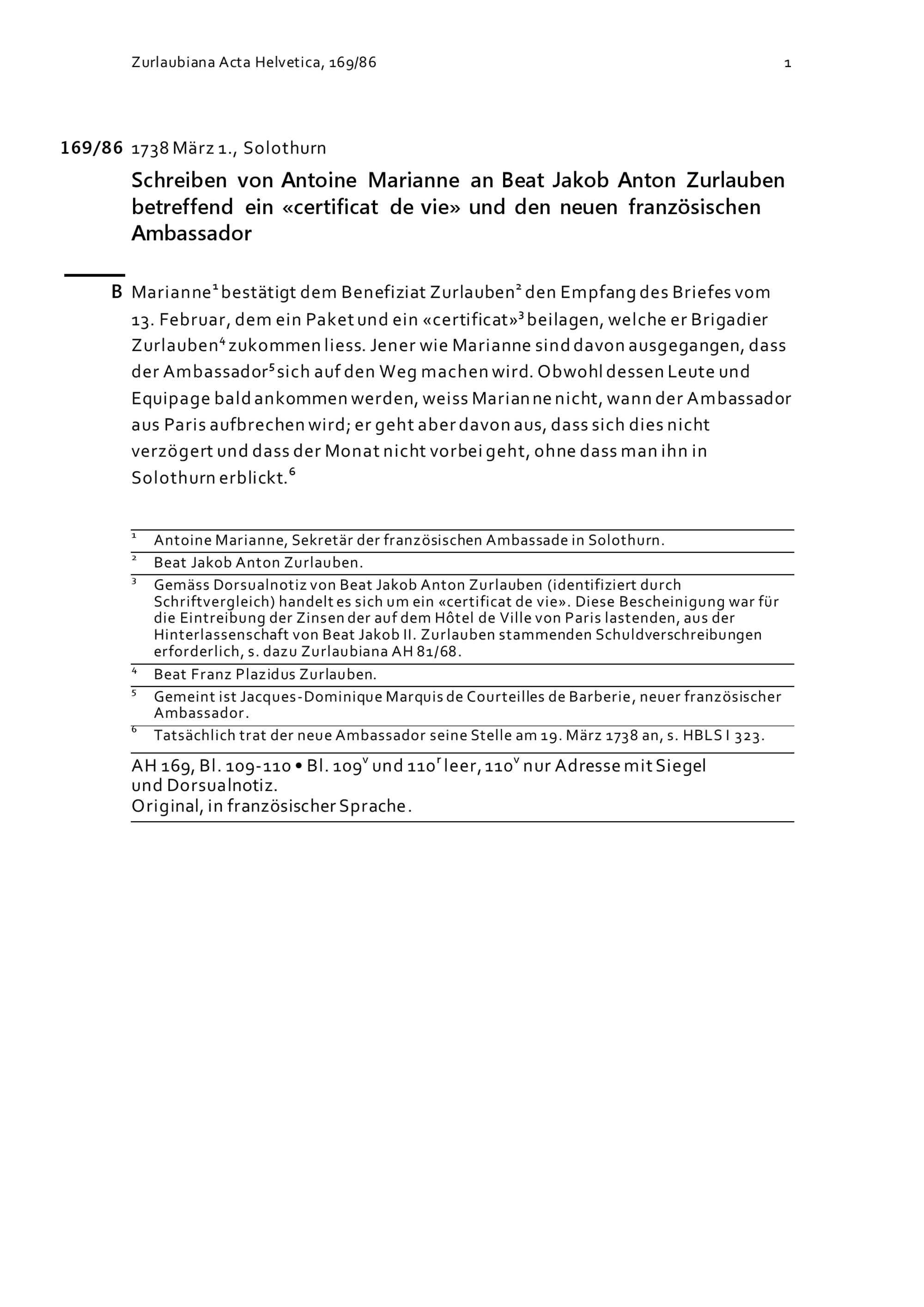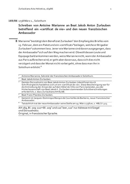 Schreiben von Antoine Marianne an Beat Jakob Anton Zurlauben betreffend ein Lebensnachweis...