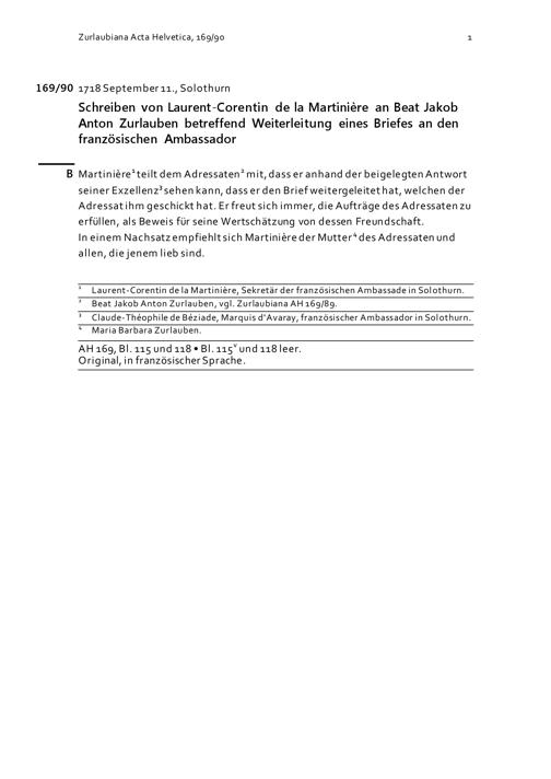 Schreiben von Laurent Corentin de la Martinière an Beat Jakob Anton Zurlauben betreffend Weiterleitung eines Briefs an den französischen Ambassador