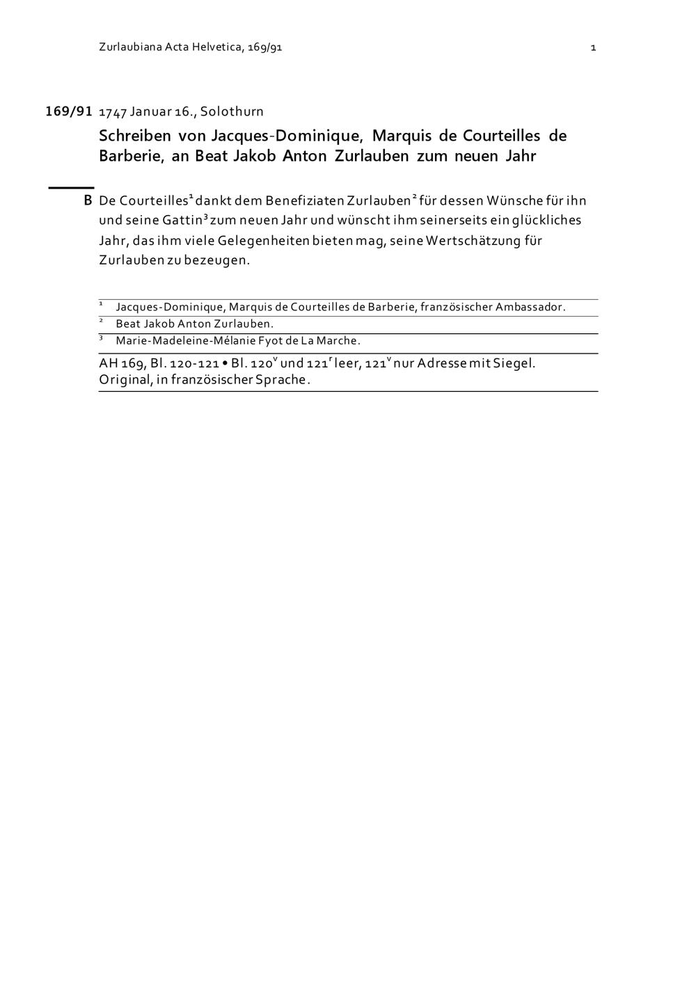 Schreiben von Jacques-Dominique, Marquis de Courteilles de Barberie, an Beat Jakob Anton zum neuen Jahr
