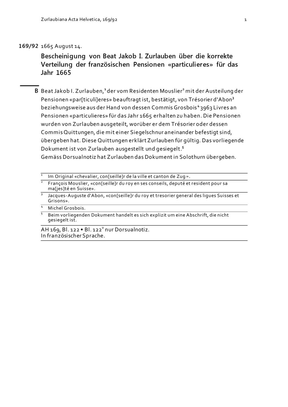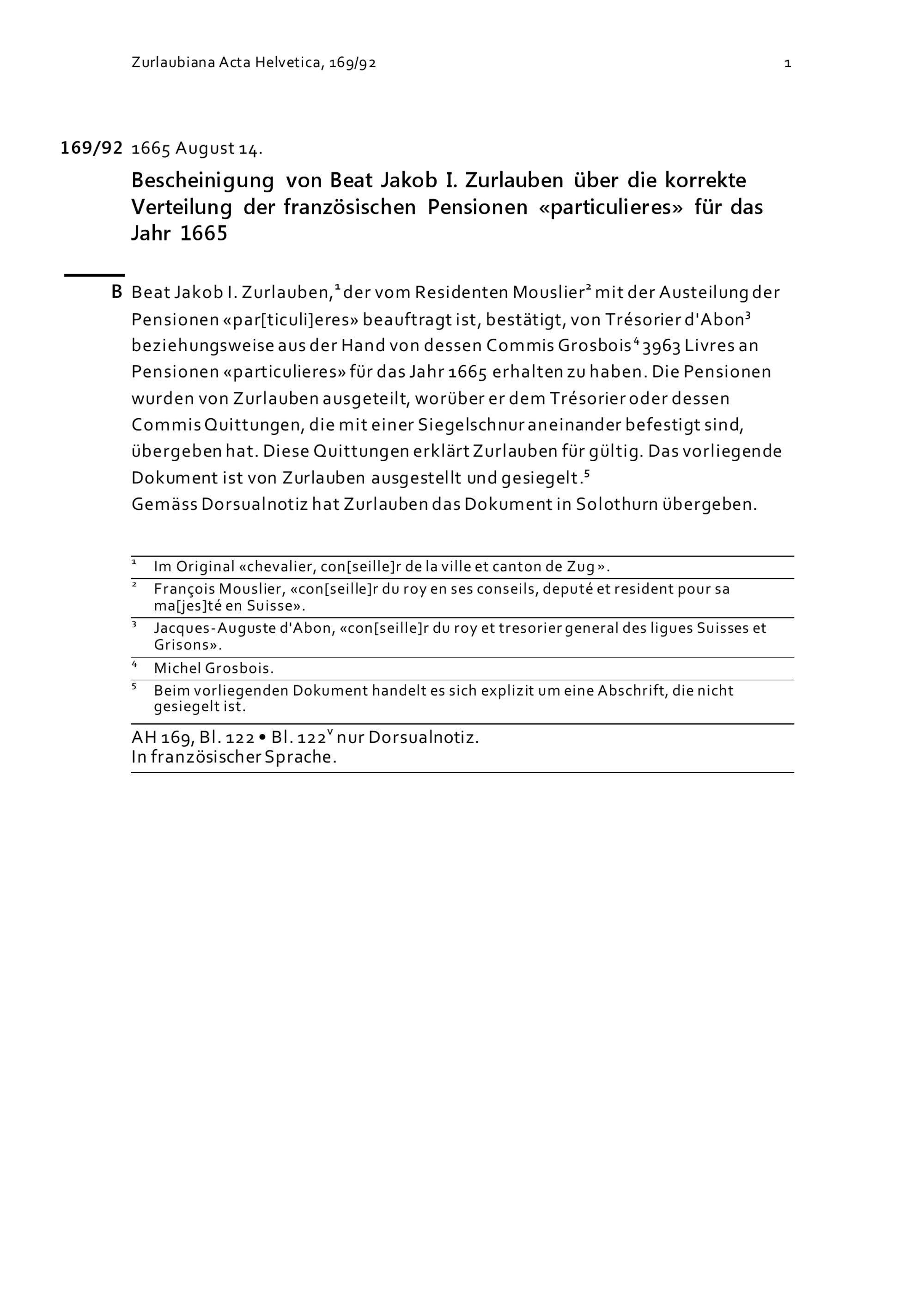 Bescheinigung von Beat Jakob I. Zurlauben über die korrekte Verteilung der französischen Pensionen für das Jahr 1665