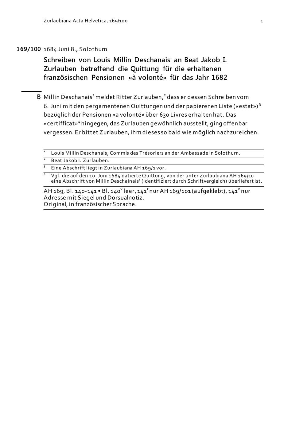 Schreiben von Louis Millin Deschanais an Beat Jakob I. Zurlauben betreffend die Quittung für die erhaltenen französischen Pensionen für das Jahr 1682