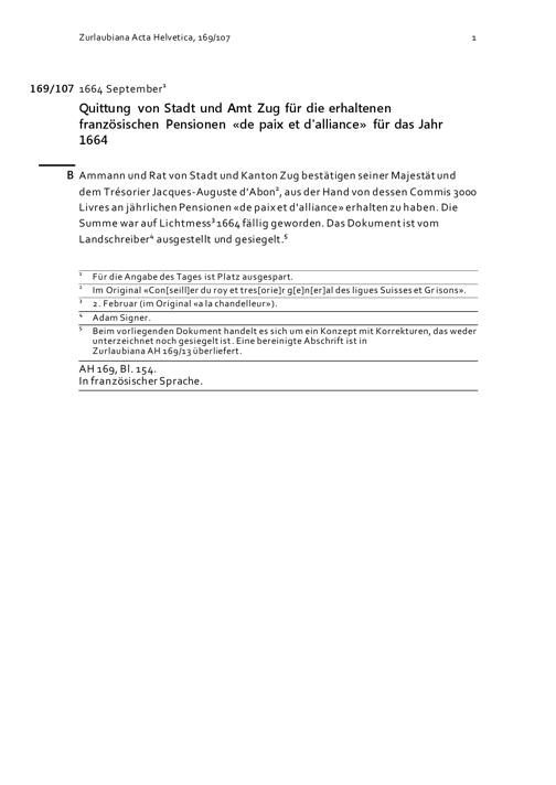 Quittung von Stadt und Amt Zug für die erhaltenen französischen Pensionen «de paix et d'aliance» für das Jahr 1664