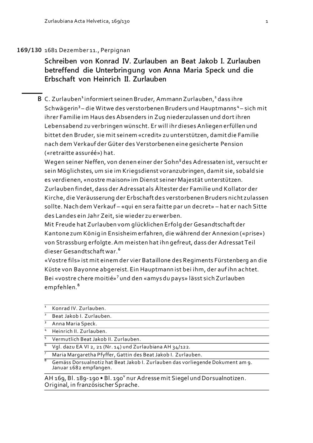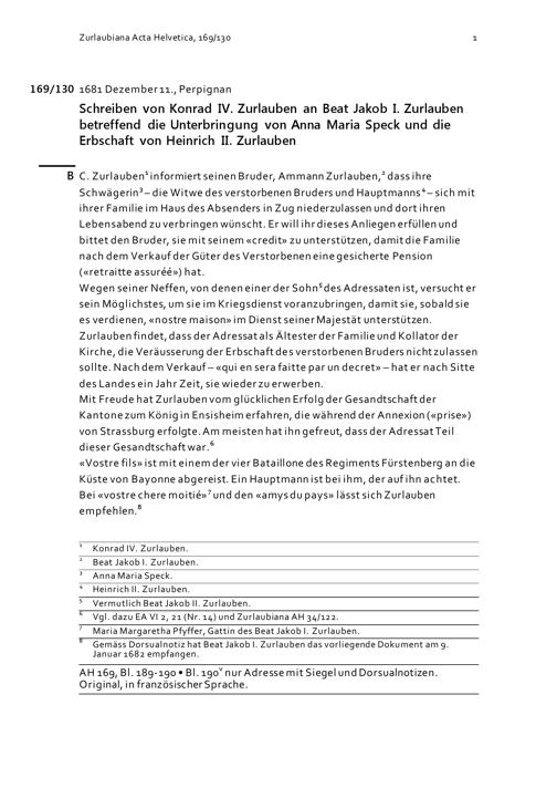 Schreiben von Konrad IV. Zurlauben an Beat Jakob I. Zurlauben betreffend die Unterbringung von Anna Maria Speck und die Erbschaft von Heinrich II. Zurlauben
