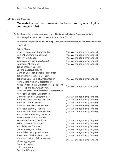 Mannschaftsrodel der Kompanie Zurlauben im Regiment Pfyffer vom August 1708