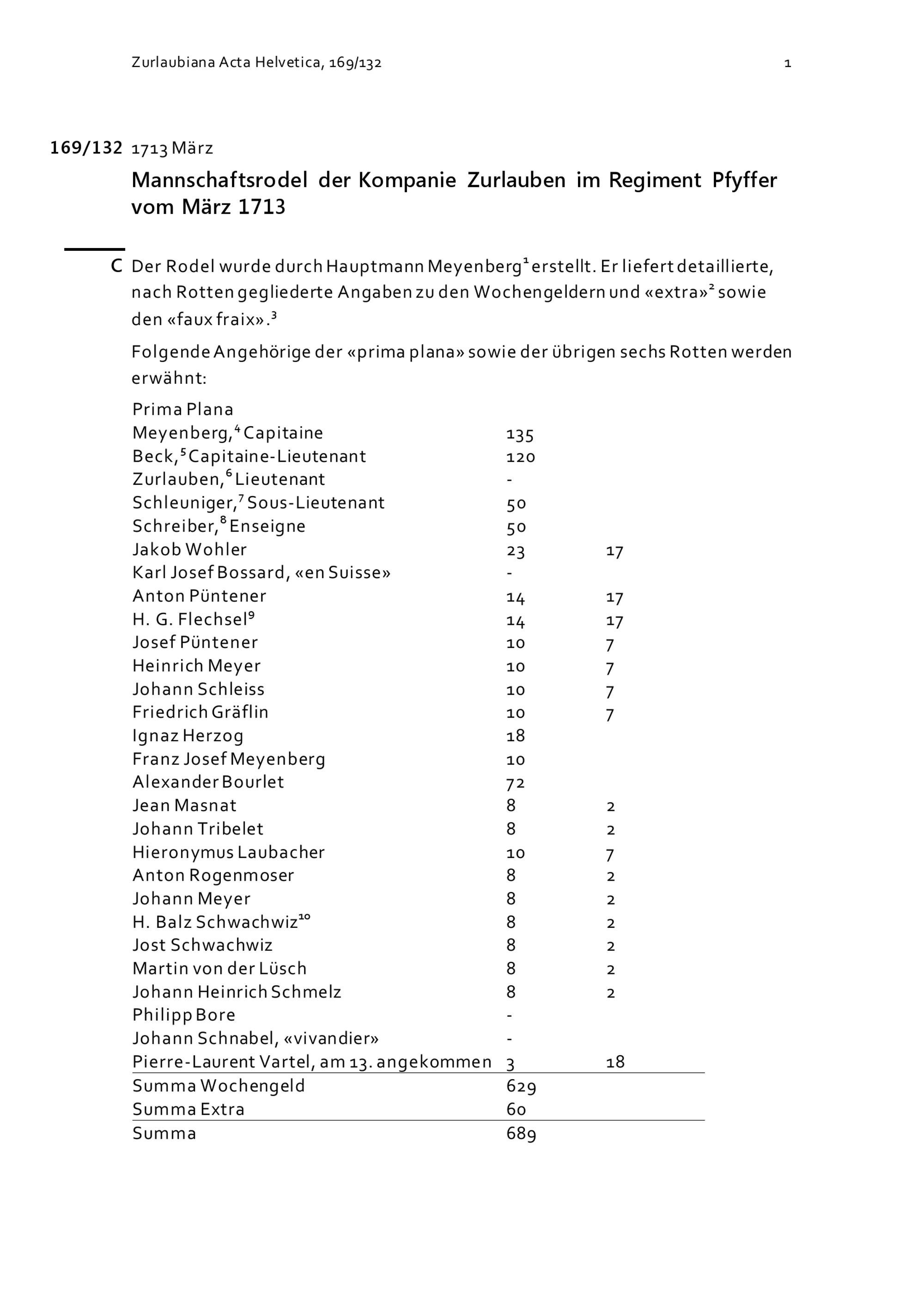 Mannschaftsrodel der Kompanie Zurlauben im Regiment Pfyffer vom März 1713