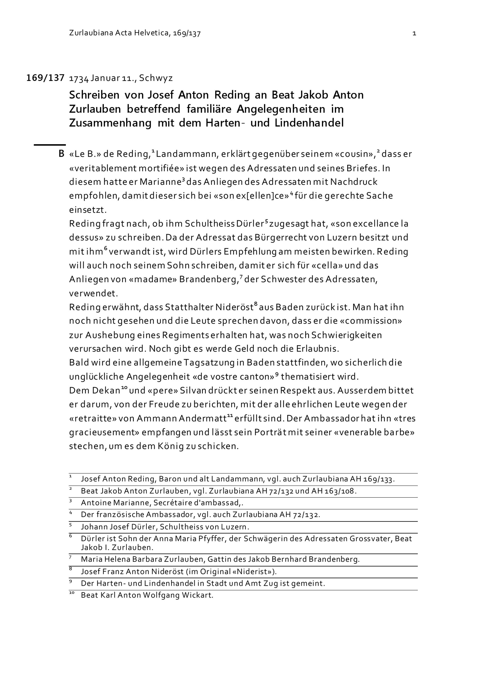 Schreiben von Josef Anton Reding an Beat Jakob Anton Zurlauben betreffend familiäre Angelegenheiten in Zusammenhang mit dem Harten- und Lindenhandel