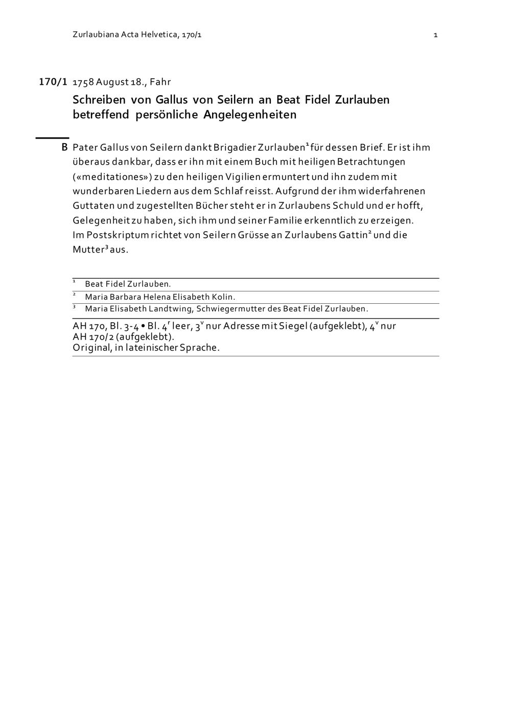 Schreiben von Gallus von Seilern an Beat Fidel Zurlauben betreffend persönliche ...