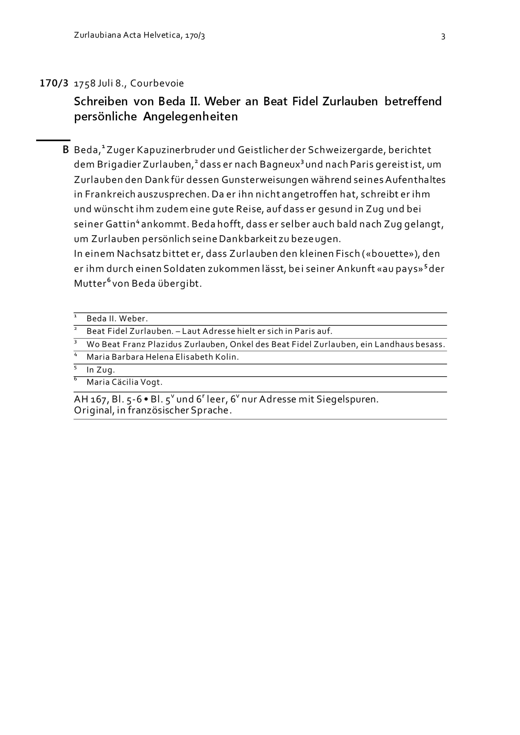 Schreiben von Beda II. Weber an Beat Fidel Zurlauben betreffend persönliche Ange...