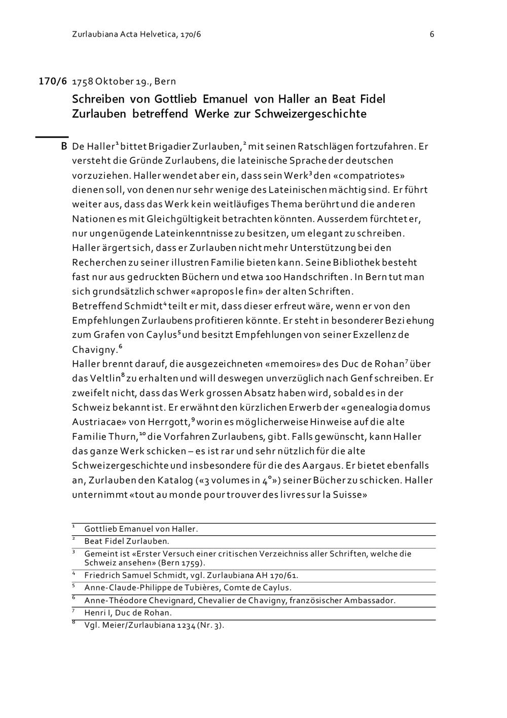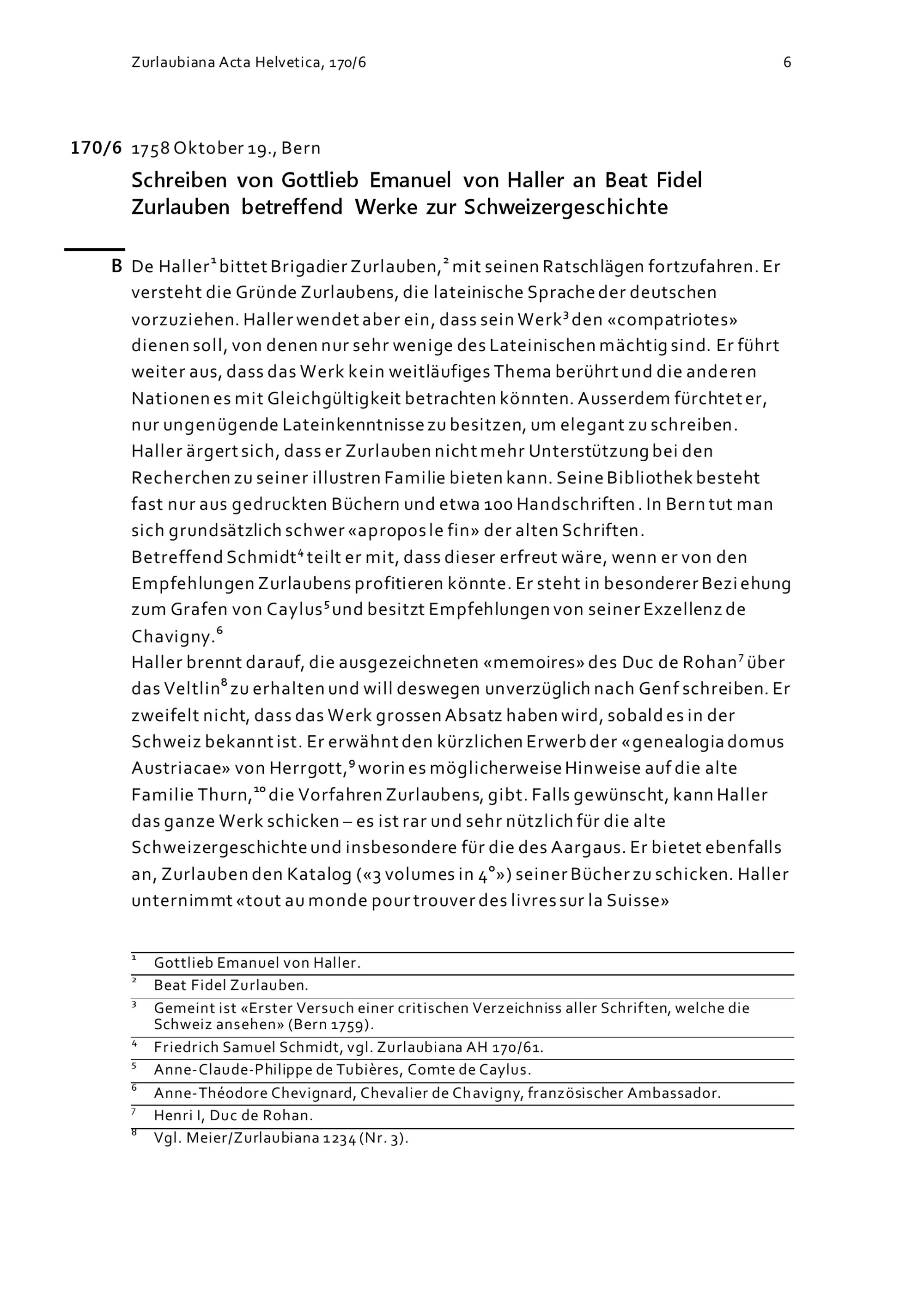 Schreiben von Gottlieb Emanuel Haller an Beat Fidel Zurlauben betreffend Werke zur Schweizergeschichte
