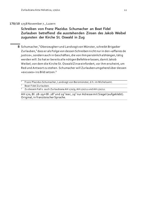 Schreiben von Franz Plazidus Schumacher an Beat Fidel Zurlauben betreffend die ausstehenden...
