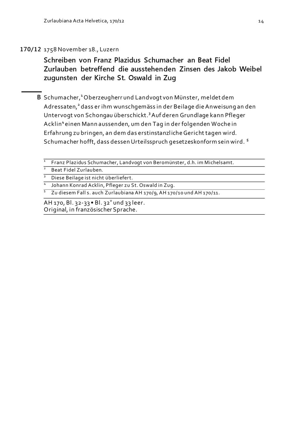 Schreiben von Franz Plazidus Schumacher an Beat Fidel Zurlauben betreffend die ausstehenden Zinsen des Jakob Weibel zugunsten der Kirche Sankt-Oswald in Zug
