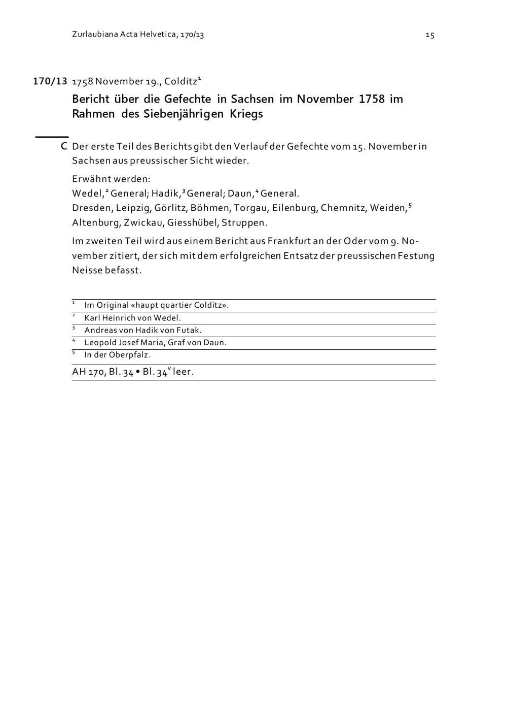 Bericht über die Gefechte in Sachsen im November 1758 im Rahmen des Siebenjährigen Kriegs