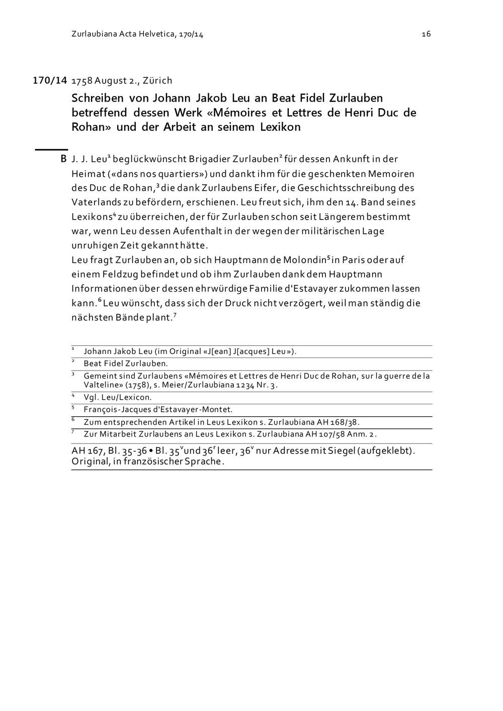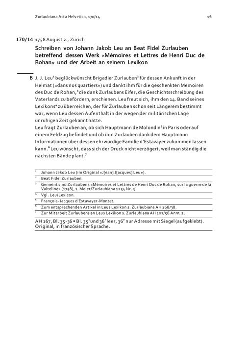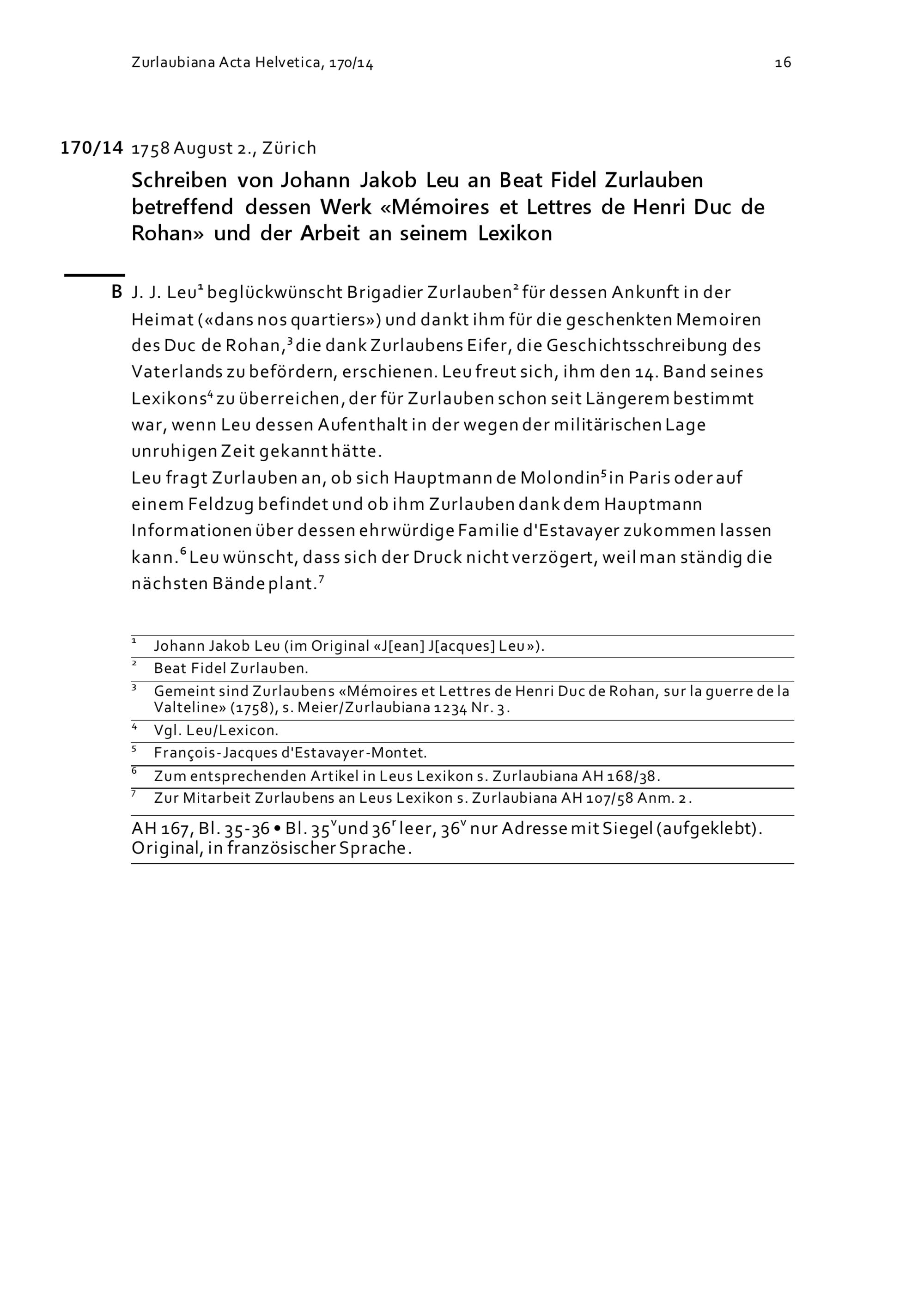 Schreiben von Johann Jakob Leu an Beat Fidel Zurlauben betreffend dessen Werk «Mémoires et Lettres de Henri Duc de Rohan» und der Arbeit an seinem Lexikon