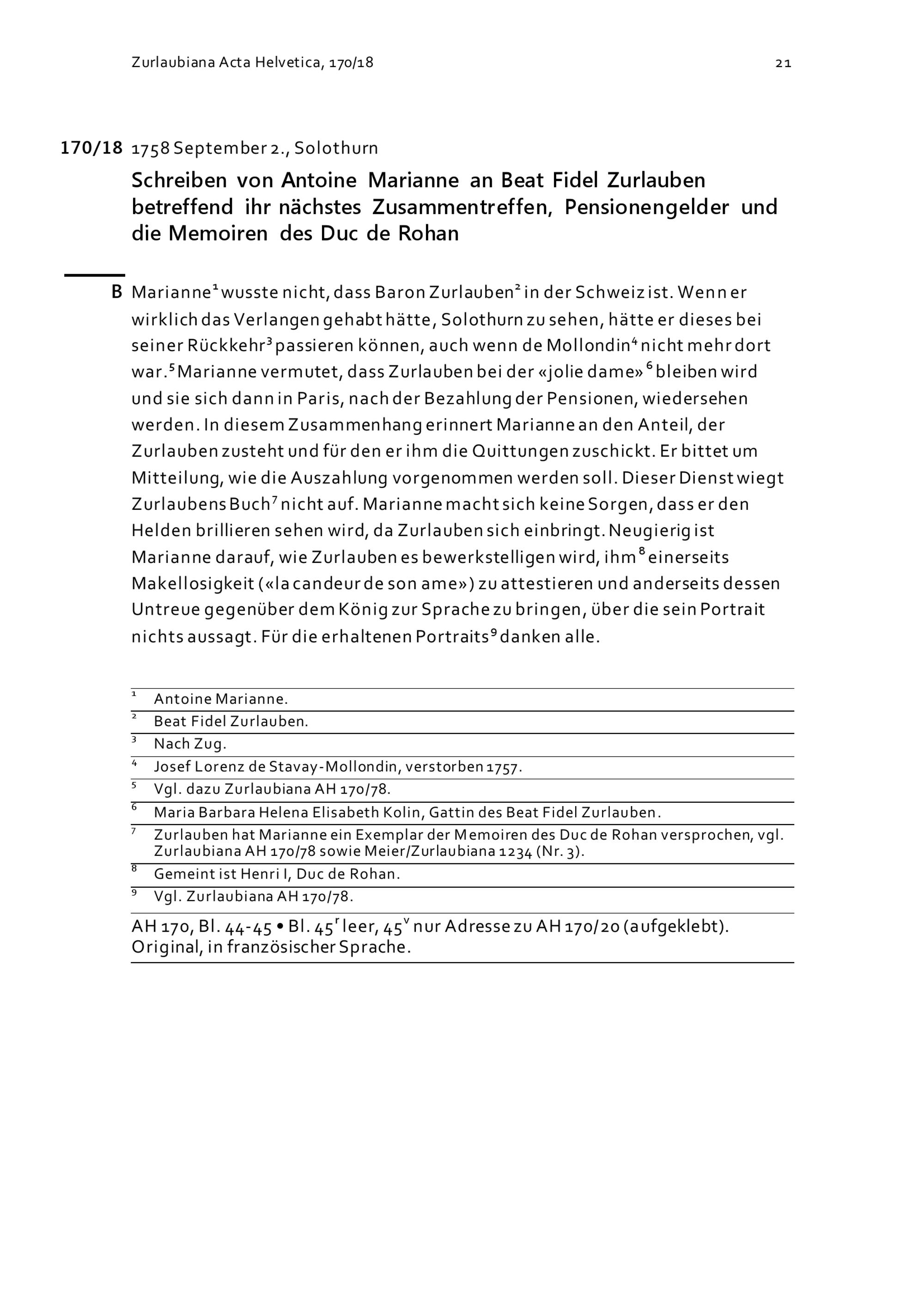 Schreiben von Antoine Marianne an Beat Fidel Zurlauben betreffend ihr nächstes Zusammentreffen, Pensionengelder und die Memoiren des Duc du Rohan