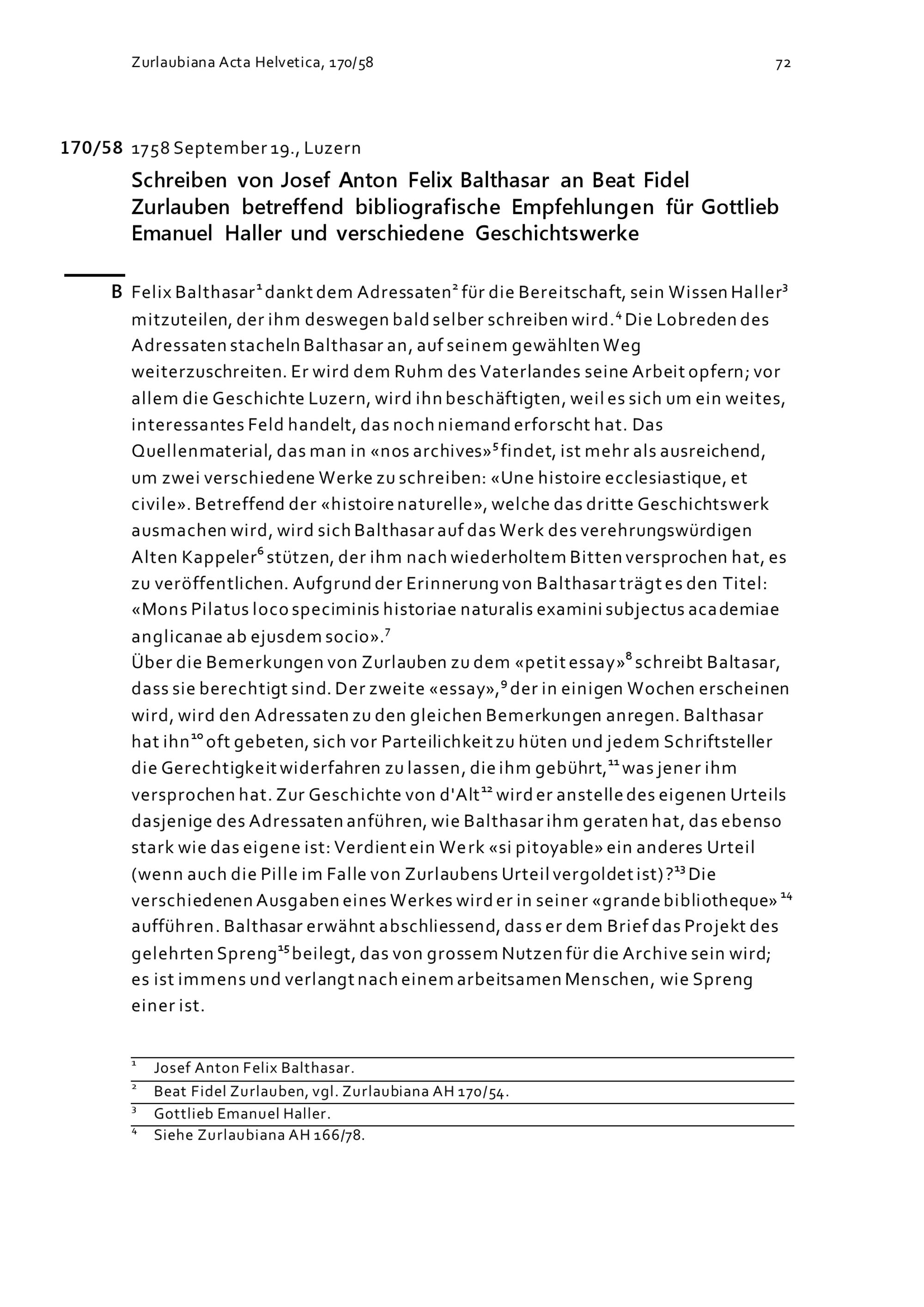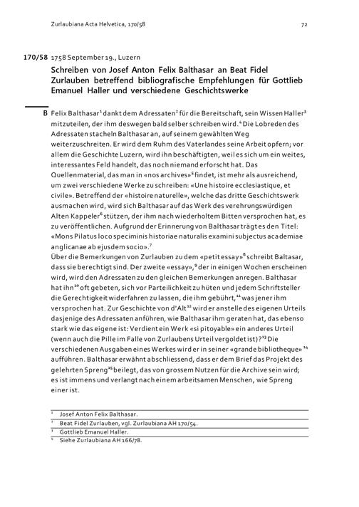 Schreiben von Josef Anton Felix Balthasar an Beat Fidel Zurlauben betreffend bibliographische Empfehlungen für Gottlieb Emanuel Haller und verschiedene Geschichtswerke