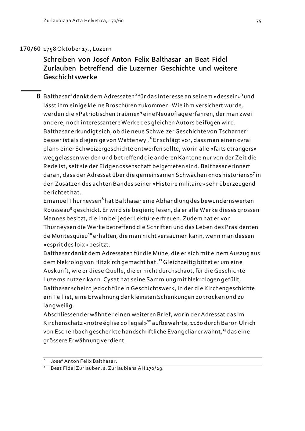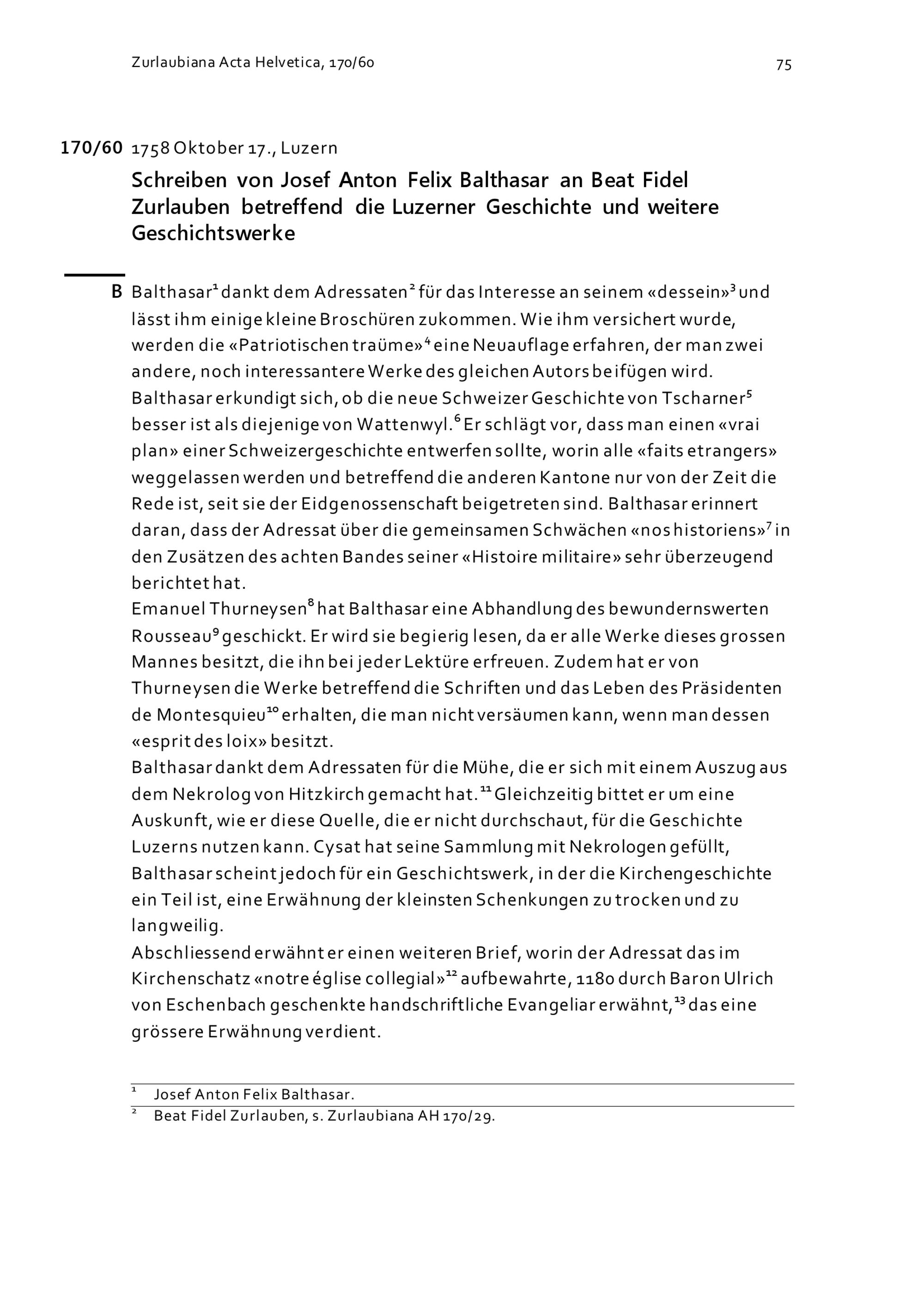 Schreiben von Josef Anton Felix Balthasar an Beat Fidel Zurlauben betreffend die Luzerner Geschichte und weitere Geschichtswerke
