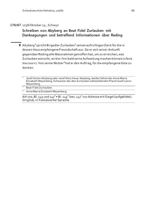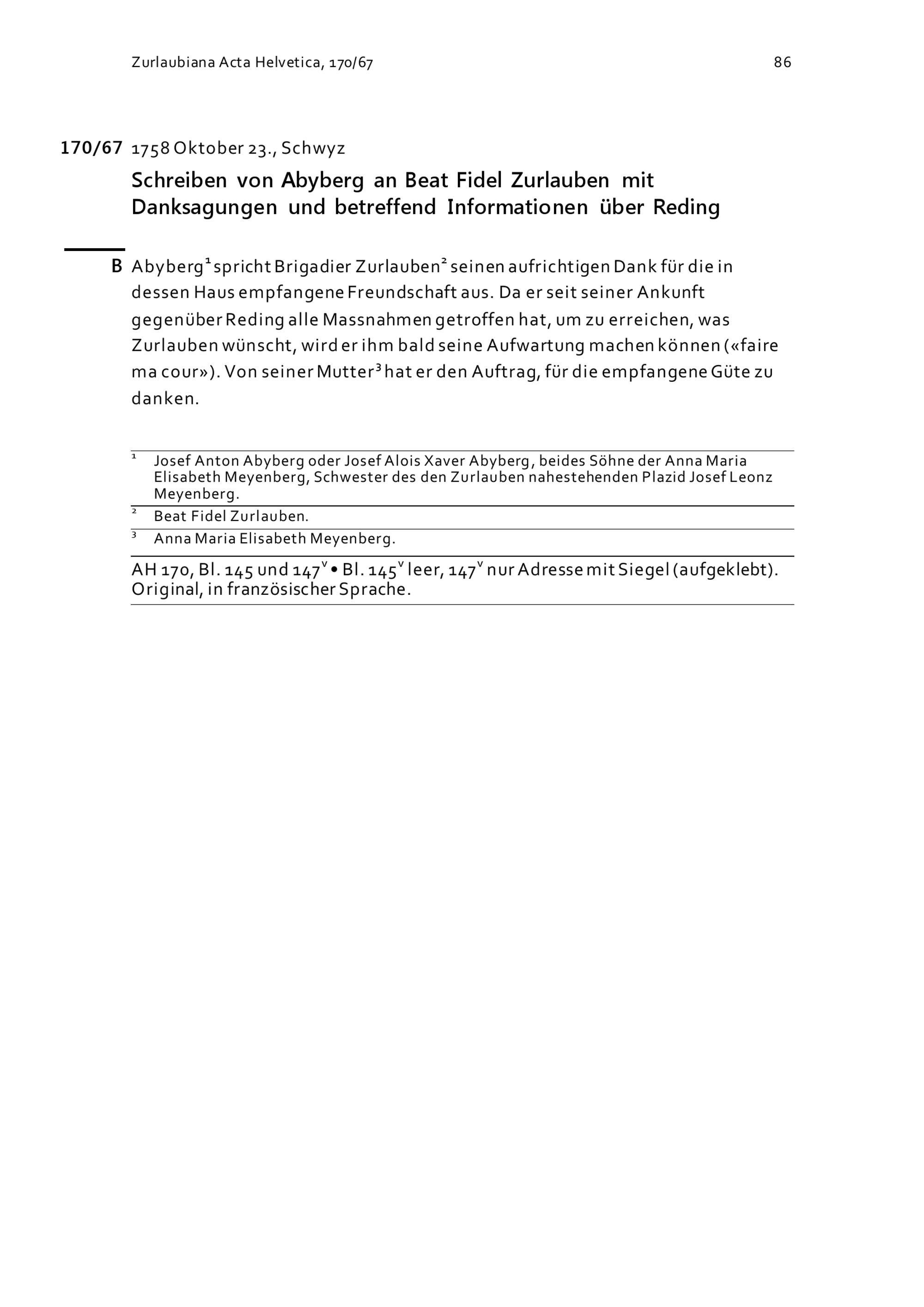 Schreiben von Ab Yberg an Beat Fidel Zurlauben mit Danksagungen und betreffend Informationen über Reding