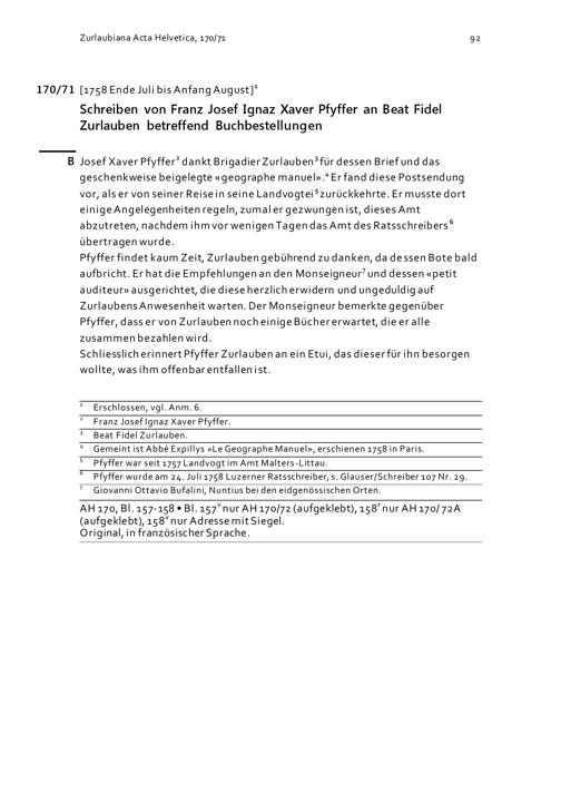 Schreiben von Franz Josef Ignaz Xaver Pfyffer an Beat Fidel Zurlauben betreffend...