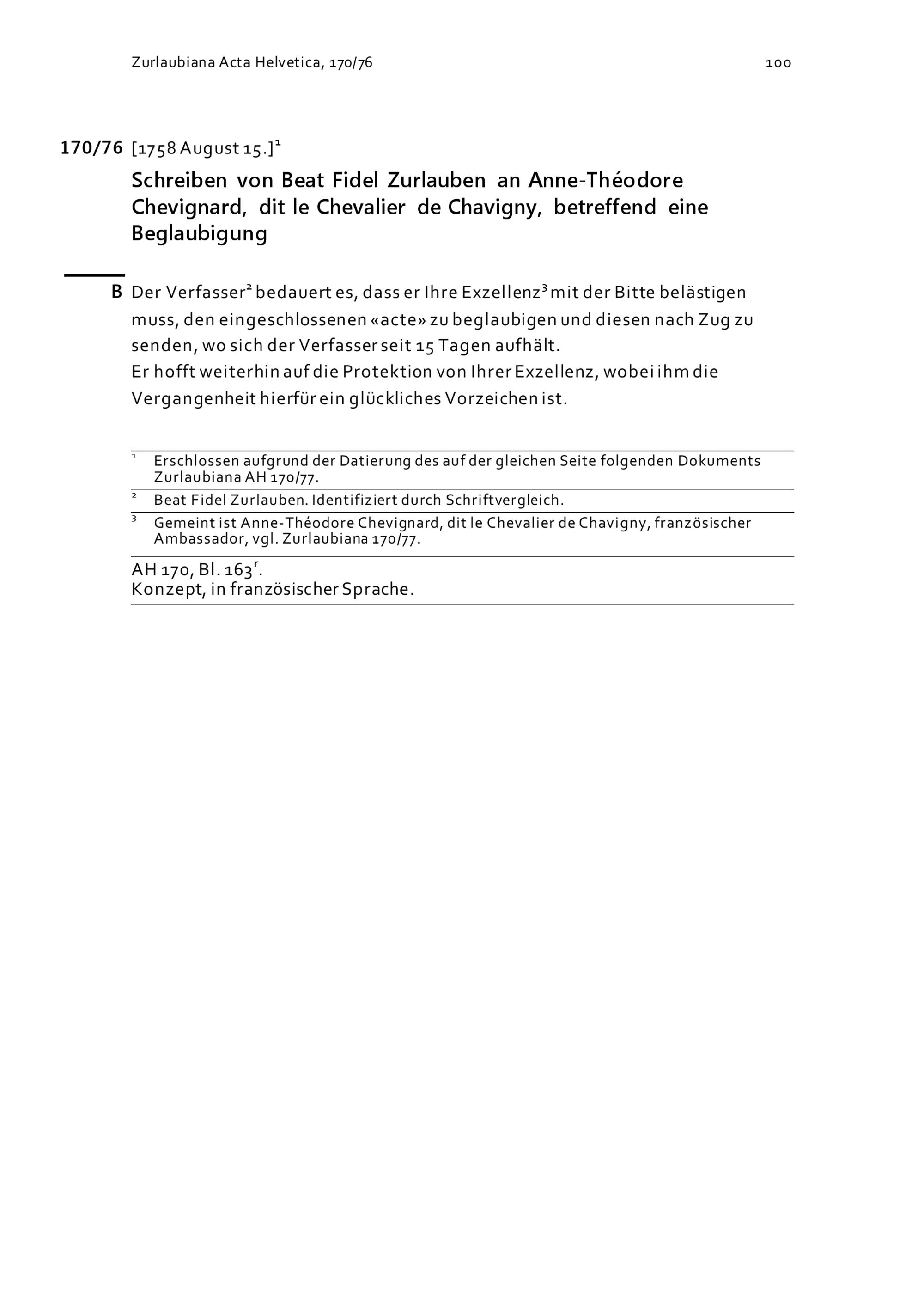 Schreiben von Beat Fidel Zurlauben an Anne-Théodore Chevignard, dit le Chevalier de Chavigny, betreffend eine Beglaubigung