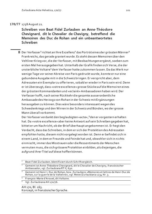 Schreiben von Beat Fidel Zurlauben an Anne-Théodore Chevignard, dit le Chevalier de Chavigny, betreffend die Memoiren des Herzogs von Rohan und ein unbeantwortetes Schreiben